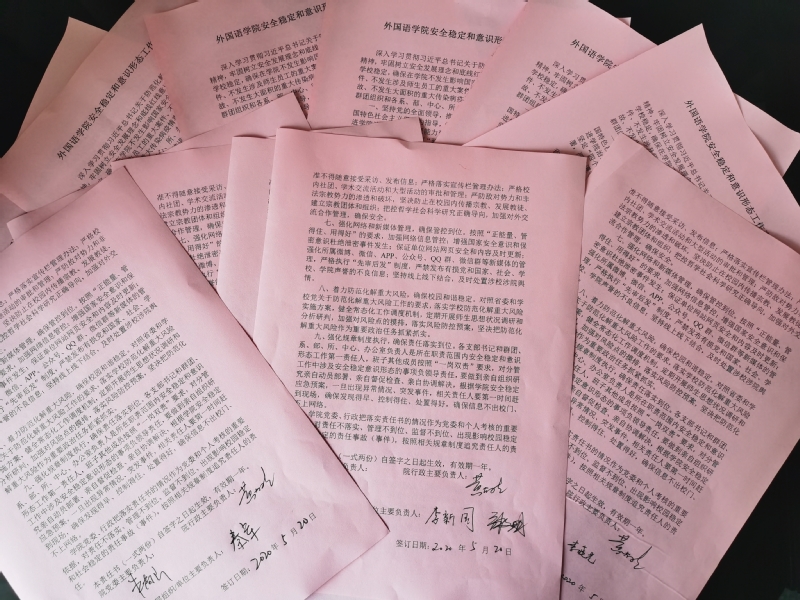 为贯彻落实学校党委关于加强安全稳定和意识形态工作的决策部署,牢牢掌握意识形态工作的领导权和主动权,切实做好学院的安全稳定和意识形态工作,5月20日下午,学院党委召开专题会议组织签订安全稳定和意识形态工作责任书。会议由院党委书记朱尚玉主持,院领导班子成员、各党支部书记和群团、系、部、所、中心、办公室负责人参加了会议。