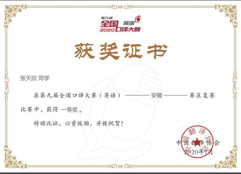 本次口译大赛由中国翻译协会主办,安徽省外国语言文学学会、黄山学院和安徽译创语言服务有限公司共同承办。受疫情影响,比赛首次在线上平台举行,比赛赛制、形式都与往年有很大的区别。比赛要求参赛选手在12分钟之内完成原音时长在60-90秒之间的汉译英及英译汉口译各一段,上述流程在半天的比赛时间中每隔一小时进行一轮,共进行三轮。每个选手可以根据自己的表现决定是否参加进行后面两轮的比赛,如果参加下一轮比赛,即视为放弃之前已取得的成绩。这种赛制不仅对选手的语言功底和理解能力、记忆和笔记能力、信息转换能力有极高的要求,更是考验选手的临场应变能力和心理素质。张天欣同学面对来自众多院校的优秀选手,其中不乏MTI翻译专业硕士选手,展现出良好的应变能力和竞技状态,凭借扎实的语言能力、流畅的口译表达和良好的心理素质,最终获得大赛的一等奖。