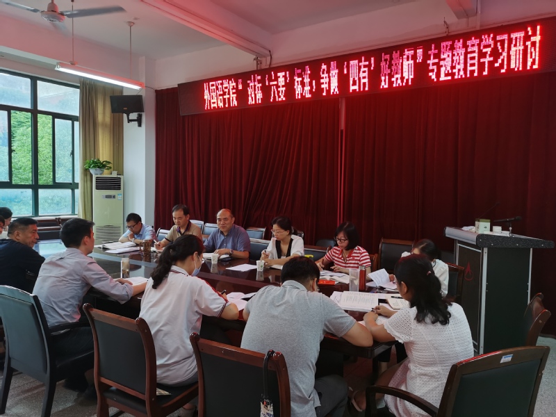 7月13日下午,外国语学院党委理论中心组在9J209会议室开展“对标‘六要’标准,争做‘四有’好教师”专题教育学习研讨活动。活动由学院党委书记朱尚玉主持,副校长费为银到会指导。
