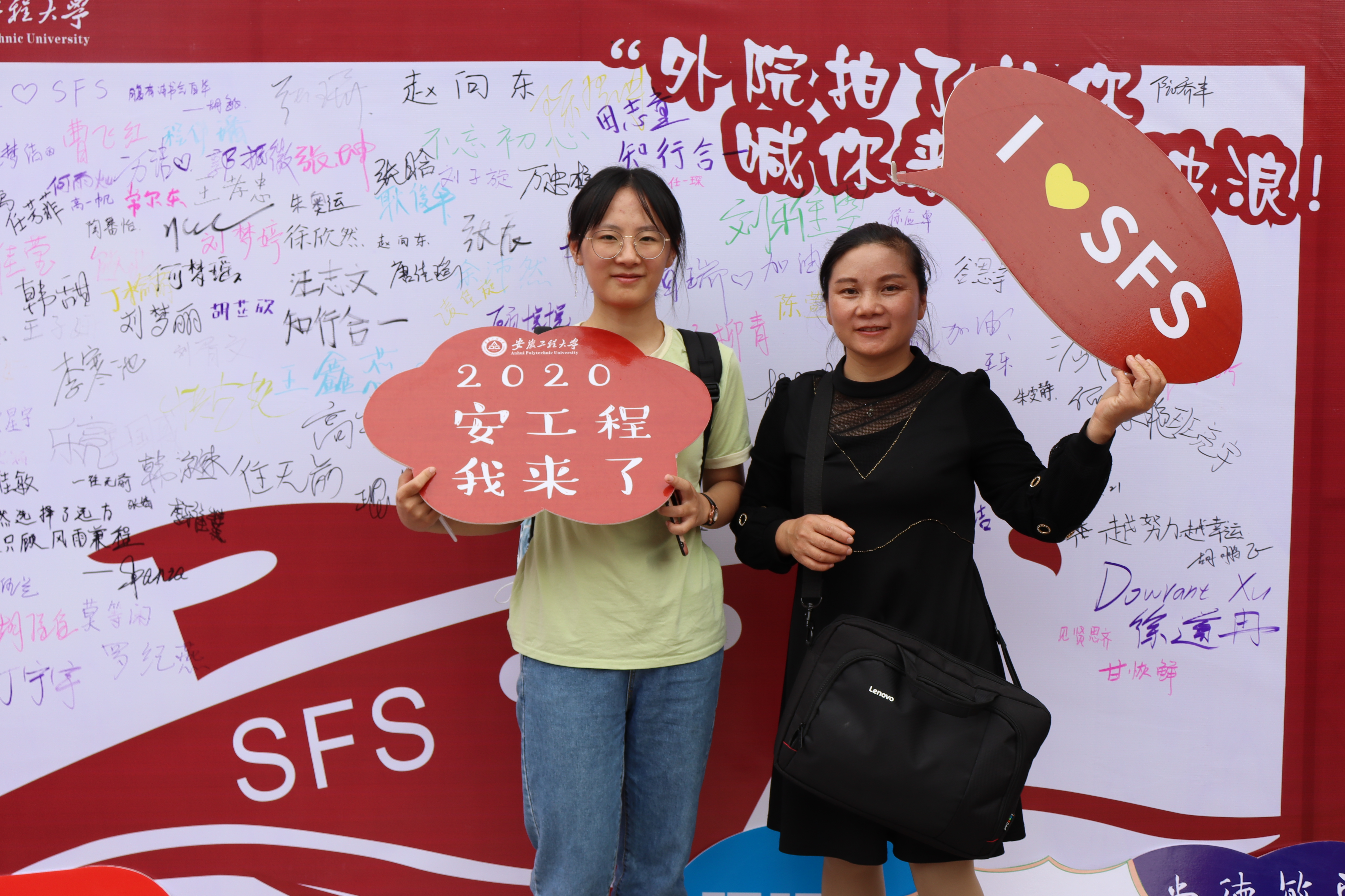 “乘风破浪”签名板,是外国语学院迎新展台的一道靓丽风景。签名板上破浪前行的红色航船图形与“乘风破浪”艺术字样相互呼应,热情地激励着新生树立理想、勇往直前、开启新生活的征途。萌新们许下心愿并郑重地签上名字,家长们也纷纷驻足合影留念。