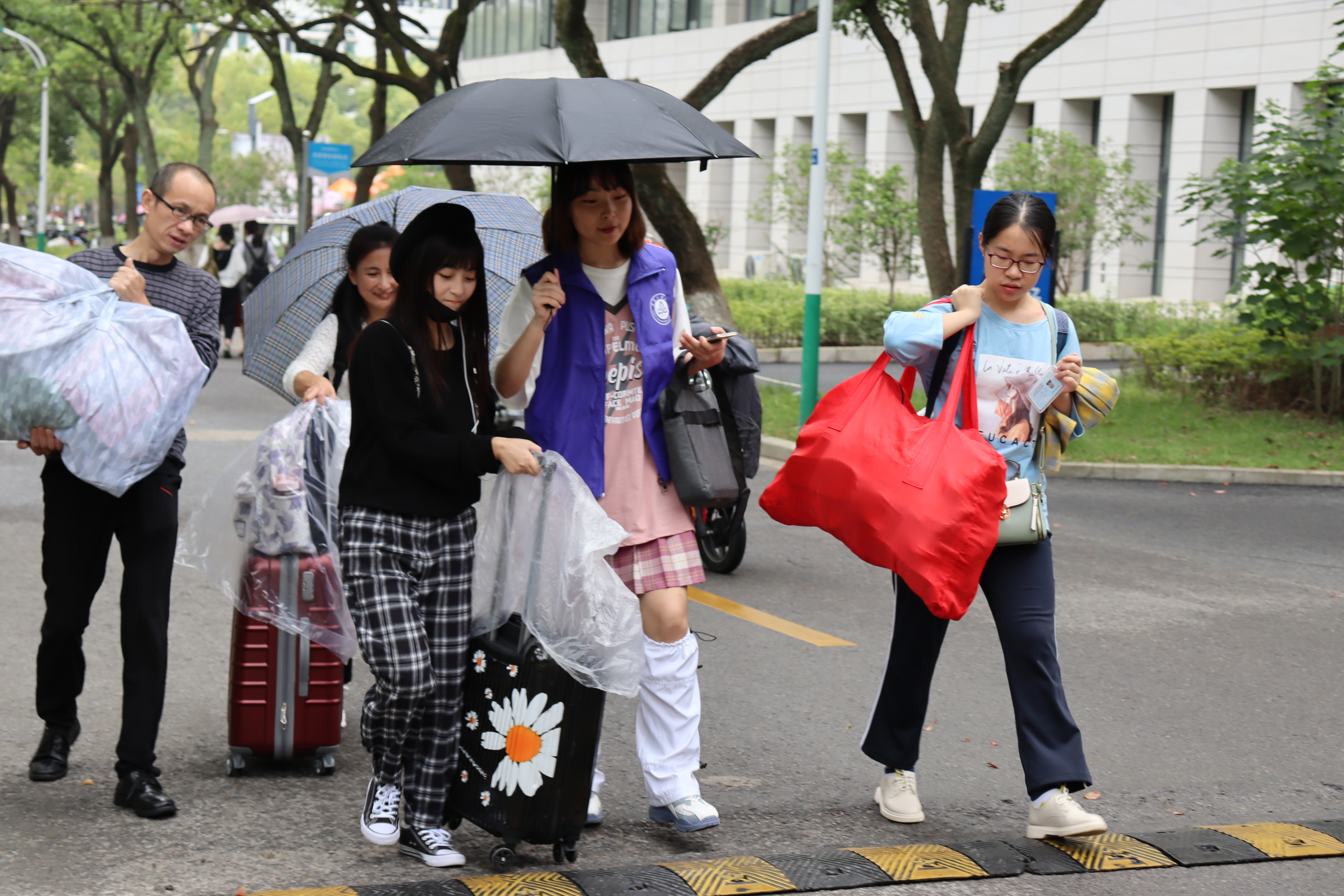 早晨6:30,外国语学院的志愿者们已经站立在各自的工作岗位上。从校门口迎接,到引导办理相应手续,再到带往宿舍,每一步都有专人负责,保证了新生顺利快捷地完成报到手续。志愿者们冒雨为新生和家长们指引道路、搬运行李,一路上热情地为他们介绍校园环境和宿舍情况。一位新生家长表示:“提着这么重的行李爬到6楼,志愿者们辛苦了。有他们帮忙,被子没有被淋湿,很感谢他们。”