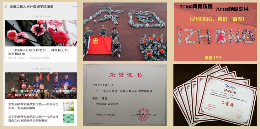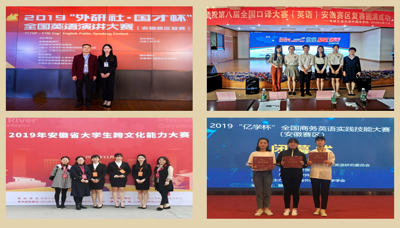 外国语学院紧抓服务人才培养的工作中心,建立团学系统与专业教师协同育人机制,打造了多项精品学科竞赛,并成功承办了高水平赛事——“外研社·国才杯”全国大学生英语挑战赛。以赛促学,以赛促创,着力提升大学生学术科技、创新创业的能力和素养。2019年,1人在全国口译大赛华东赛区获得三等奖,1人在全国大学生英语竞赛(省赛)中获得一等奖,2人分别在全国大学生英语演讲、阅读比赛(省赛)中获得一等奖,全年有48人次在省级及以上赛事获奖。院团委还积极开展形式多样的文体活动,助力团员青年综合素质的提高。连续两年成功承办校新生才艺大赛,丰富了校园文化建设的内容。组织广大团员青年参加各种文化、艺术、体育类竞赛,在校书画作品大赛、校舞蹈大赛、校“三民”晚会、校大合唱比赛中多人获奖,1人在安徽省第五届大学生艺术展演中获二等奖;体育赛事中成绩不断突破,1人获安徽省大学生足球联赛女子组第五名,1人获安徽省大学生足球联赛男子组亚军,文化育人逐渐取得成效。