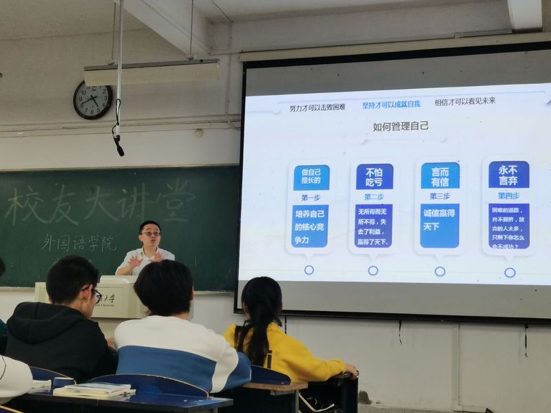 为充分发挥优秀校友的典型示范作用,引导同学们做好学业规划和大学生涯规划,提升同学们就业创业能力,2020年11月18日下午4点,外国语学院在6教111举办了校友创业大讲堂。外国语学院2005届英语系毕业生、复旦大学MBA,上海赛宁培训学校有限公司创始人章恒应邀为2020级本科生做了一场精彩的报告,他围绕“奋斗的青春最美丽”的主题,从积极适应社会、做自己擅长的事、培养优秀品质几个角度分享了自己的创业故事。