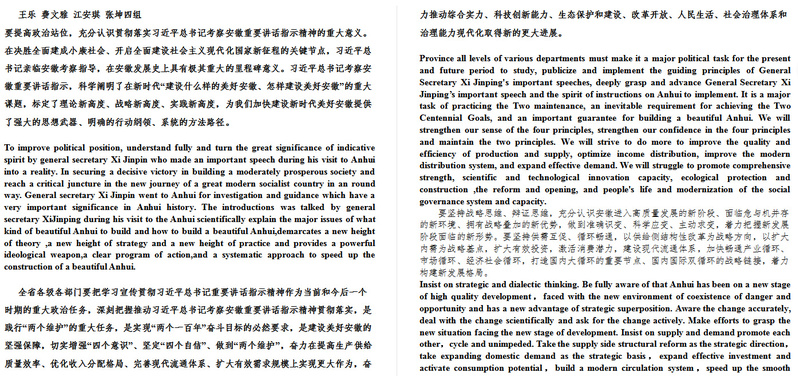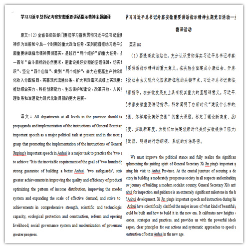 支部在集中学习习近平视察安徽重要讲话指示精神的基础上,凝练出部分精彩内容,运用专业优势将讲话内容的中文翻译成英文,一面政治学习,一面专业研讨。每个教师党员在自己的班级也布置了习近平视察安徽重要讲话指示精神的翻译作业,将学习讲话精神融于课堂教学,让学生也参与到思想政治学习和翻译实践中来,并遴选出部分优秀学生作品进行表彰。