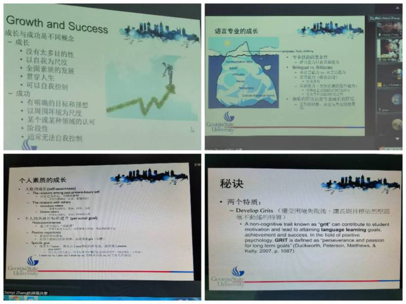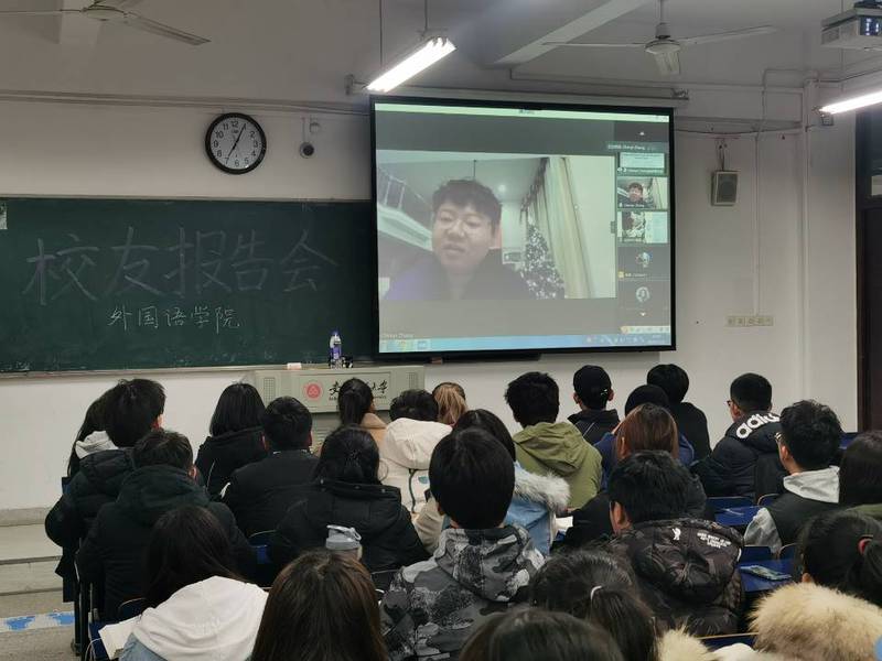 为充分发挥优秀校友的典型示范作用,引导同学们更好地做好职业生涯规划,12月13日晚上,外国语学院在5教503举办了校友线上报告会。外国语学院2005届英语系毕业生——美国乔治亚州立大学终身教授张琛奕,围绕“成长”与“成功”两个关键词,从两者之间的关系、成长模式、成长秘诀提升等几个方面应邀为2020级本科生做了一场精彩的线上报告。报告会由学院2020级辅导员张君主持。