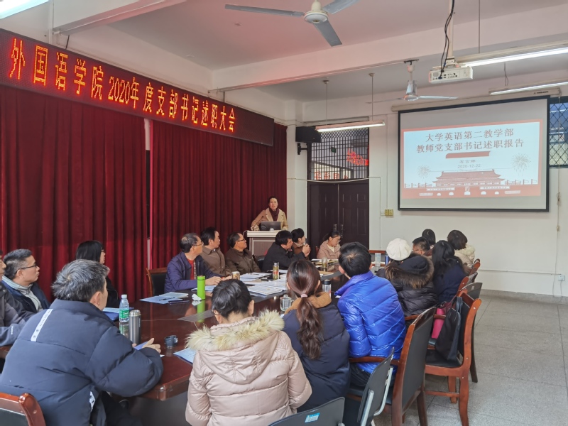 近日,外国语学院党委2020年度党支部书记述职评议会在9J209举行。学院党委委员、党支部书记、科级以上干部、系(部、所)负责人以及部分“两代表一委员”和师生党员代表参加了会议,会议由党委书记朱尚玉主持。