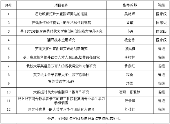 根据教务处《关于2021年大学生创新创业训练计划项目申报及近三年工作总结报送的通知》精神,我院省级项目申报限额12项,其中国家级项目申报限额4项(含重点支持领域项目,每个学院不超过1项),省级项目申报限额8项。今日,学院组织教授委员会成员、校院两级督导和系部主任对20项申报项目进行评审。根据评审综合排名结果,对国家级、省级项目进行等额推荐,项目信息公示如下: