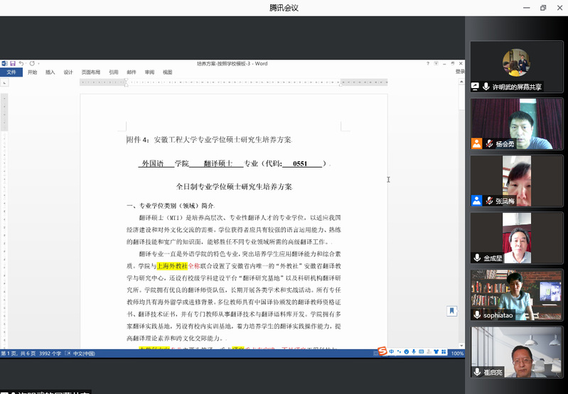 7月6日下午外国语学院在9J209开展了线上线下结合的翻译硕士培养方案专家论证会。会议线上邀请了华中科技大学外国语学院院长、博士生导师、第三届全国翻译专业学位研究生教育指导委员会学术委员会委员(2018 - 2021)许明武教授,复旦大学外文学院翻译系主任、博士生导师陶友兰教授和对外经济贸易大学硕士生导师、中国翻译协会本地化服务委员会副主任崔启亮博士参加,线下参加的老师有外国语学院院长金成星教授、副院长唐雪梅教授、张凤梅副教授和杨会勇副教授。会议由金成星院长主持。