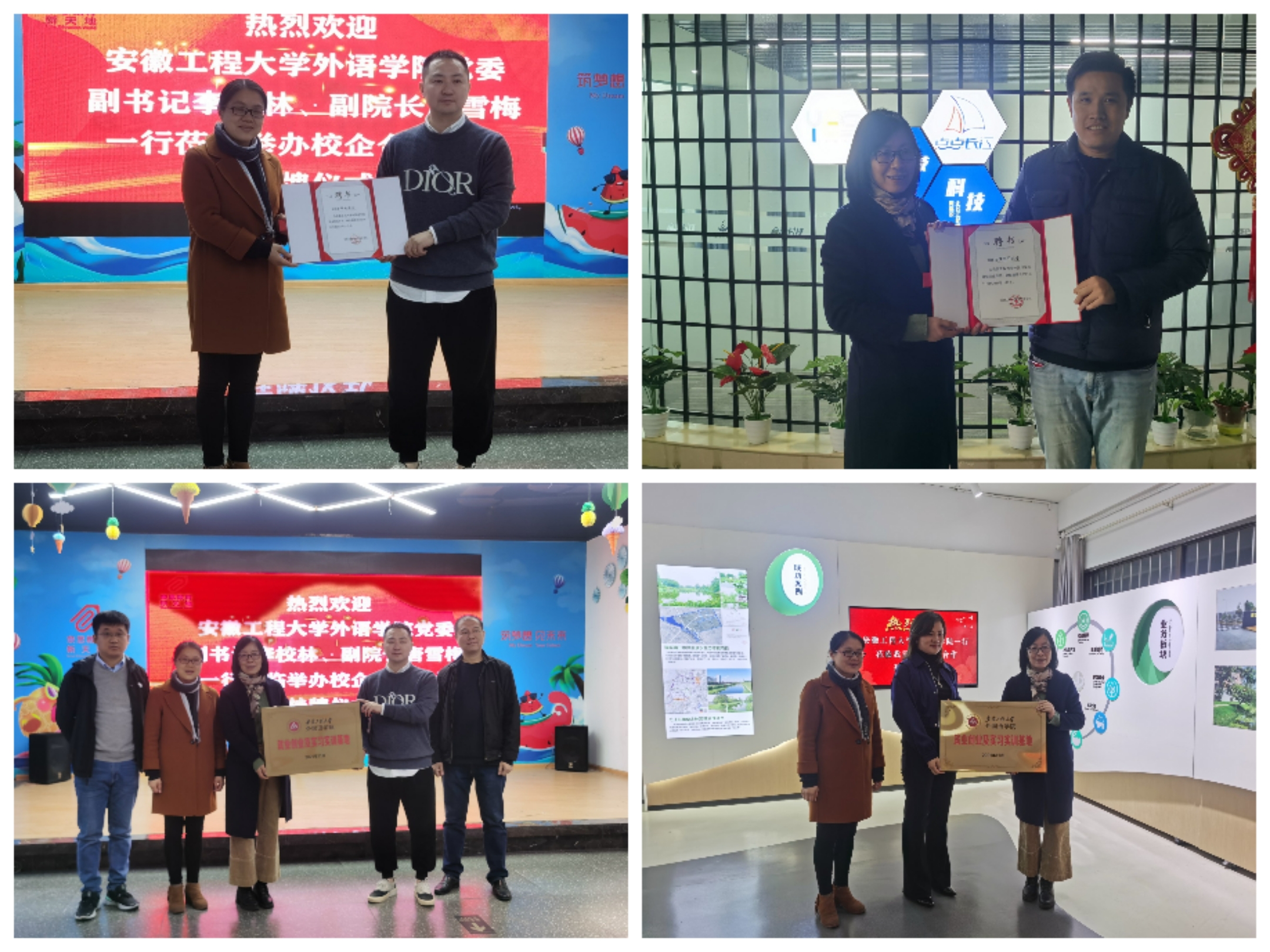 三家公司负责人郑锐、汪国罕、江亚琴对学院一行的到来表示热烈欢迎,并介绍了各自企业创办及发展历程。在交流过程中,李校林表示,目前芜湖市正在推动人民城市建设,双方进行校企合作正当其时,希望通过合作搭建好企业招聘和毕业生就业的桥梁,也希望借力企业家丰富的就业创业经验,为在校生开展就业创业指导。唐雪梅表示,在人才培养过程中,实习是重要一环,后期学院将根据三家企业分属教育培训、长江航道智能化物流、生态环保等行业特点,深入研究企业用人需求,推动落实毕业实习实训。交流最后,李校林与企业负责人签订校企合作协议,唐雪梅向企业负责人授予就业创业及实习实训基地牌匾,颁发了外国语学院校外就业创业导师聘书。