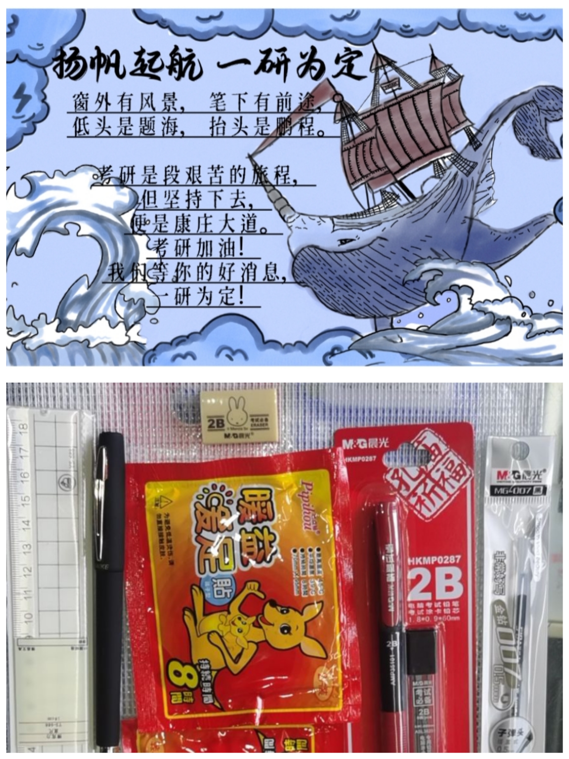 暖物传温情。15日,学院为考研学生精心准备了“暖心礼包”,每一样都有其美好的寓意:孔庙祈福文具套装助力考生妙笔生花;保暖贴为考生保驾护航,暖身更暖心;还有学弟学妹们手绘的手抄报,祝福考生成功上岸,一“研”为定。