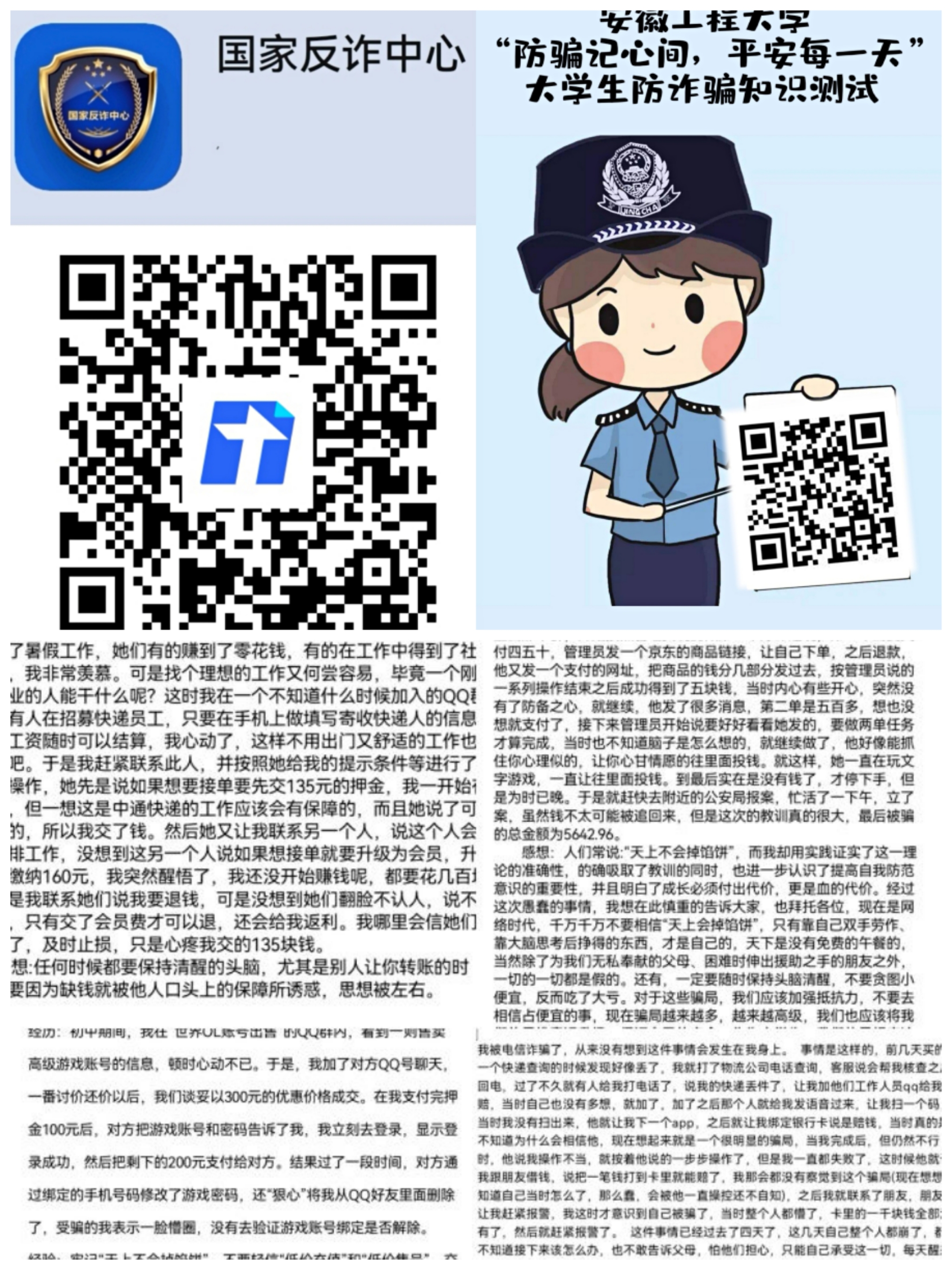 21日,校“防骗记心间平安每一天”大学生防诈骗知识测试竞赛在活动官方QQ群内进行。近500余人参与线上答题,通过答题同学们进一步了解各类诈骗类型,学习防诈骗知识,以及如何应对处理各类诈骗陷阱,挽回损失。22日,志愿者们在三食堂、五食堂开展“防骗记心间平安每一天”主题横幅签名活动,活动反响热烈,近300名同学参与签名,积极响应倡议,强化防诈骗意识。23日,志愿者们在活动官方QQ群内宣传“国家反诈中心”APP快速举报涉诈线索、高效预警劝阻提示、远程身份验证等多种功能,动员同学们积极下载。近400余名同学通过扫秒二维码下载APP。24日,活动在保护同学个人隐私的前提下开展受骗案例征集,68名同学参与投稿。接收到的稿件中,既有“好评返现”被诈骗的案例,也有轻信陌生电话进行绑卡操作受骗的案例。在所有征集到的案例中,好友QQ被盗导致的受骗案例占比最高,达到37%。这些都进一步提醒同学们,一定要牢记“不汇款,不轻信,不泄露,不链接”的“四不”警句,切实保障自身安全。