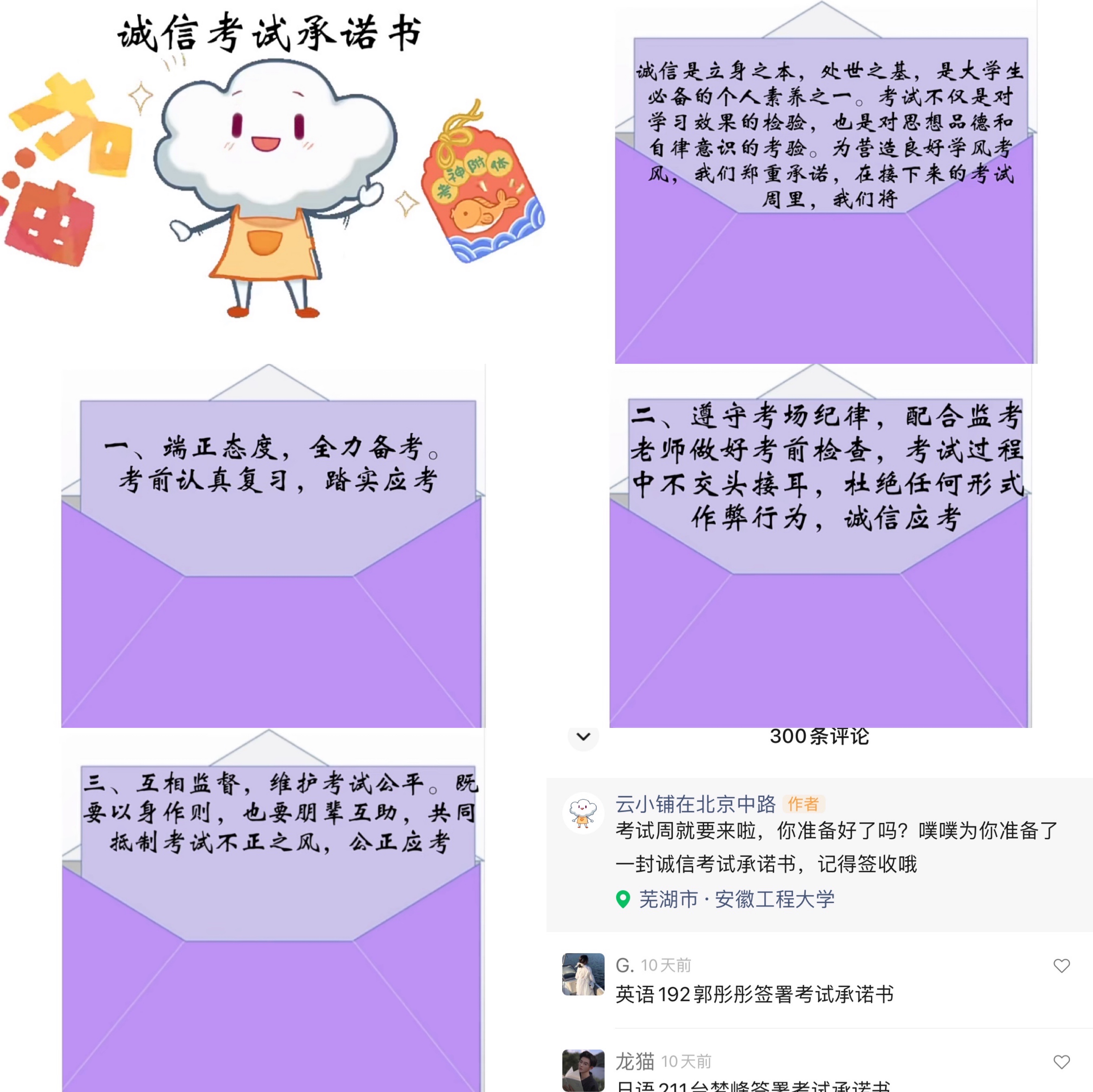 广大同学响应倡议,作出诚信承诺。外国语学院广大学生响应诚信倡议,通过线上线下方式签订诚信考试承诺书,承诺在考试中严格遵守考场管理规定和考生守则,坚决服从考场老师管理,不作弊,也不协助他人作弊,通过良好表现践行社会主义核心价值观。学院还发起了“文明考风 诚信考试”主题横幅签名活动,得到同学们的积极参与。