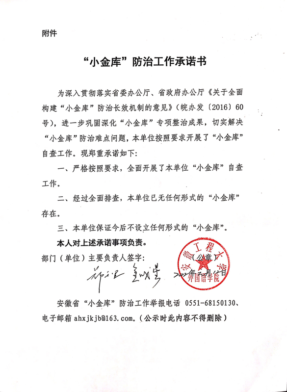 根据学校《关于在全校范围内开展“小金库”排查工作的通知》,学院认真组织开展相关工作,党政主要负责人签署了《“小金库”防治工作承诺书》,现将承诺书公式如下: