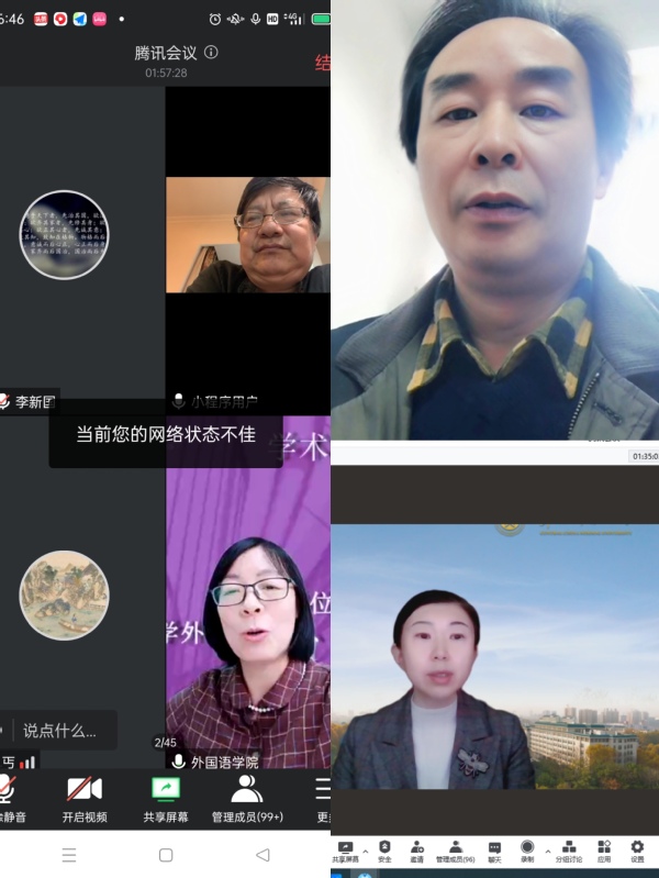 4月13日和14日下午,外国语学院在线上举办了雷竞技rebent 月系列报告会。应外国语学院、科技处和研究生部的邀请,浙江大学胡志毅教授、华中师范大学苏晖教授作了学术报告。外国语学院金成星教授和唐雪梅教授分别主持了报告会。外国语学院部分教师、研究生及国内其他高校的师生近300人通过线上和线下相结合的方式聆听了报告会。