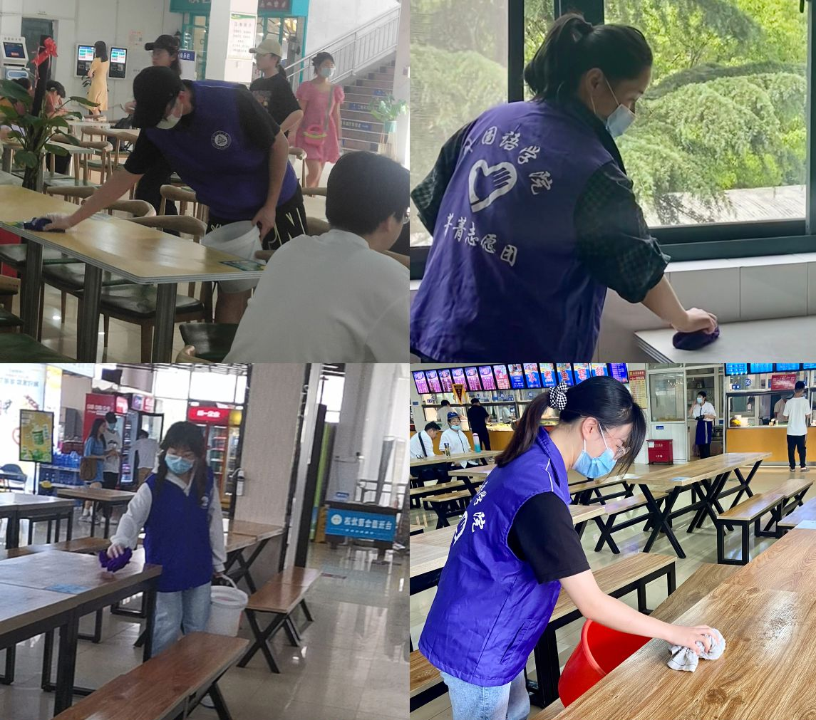 各小组分工明确,按时到达指定地点,井然有序地开展活动。在图书馆,志愿者们把读者还回的图书按类别推到不同的楼层,分类排序,依次上架;在6教教室,志愿者们擦去黑板上的字迹、抹去讲台上的灰尘并清理掉课桌桌肚中的垃圾;在女生1栋和7栋宿舍楼,志愿者们将楼道里的垃圾集中起来,运送到楼外的垃圾箱;在三、四食堂,志愿者们一手拿着抹布,一手提着水桶,及时清理掉油腻的餐桌垃圾;在校园内,志愿者们按顺序合理摆放共享单车和电动车,方便路人行走。天气炎热,汗水浸透了志愿者们的衣服,但他们洋溢着青春气息的脸上却有着一丝坚毅和倔强,保质保量地完成各项任务。