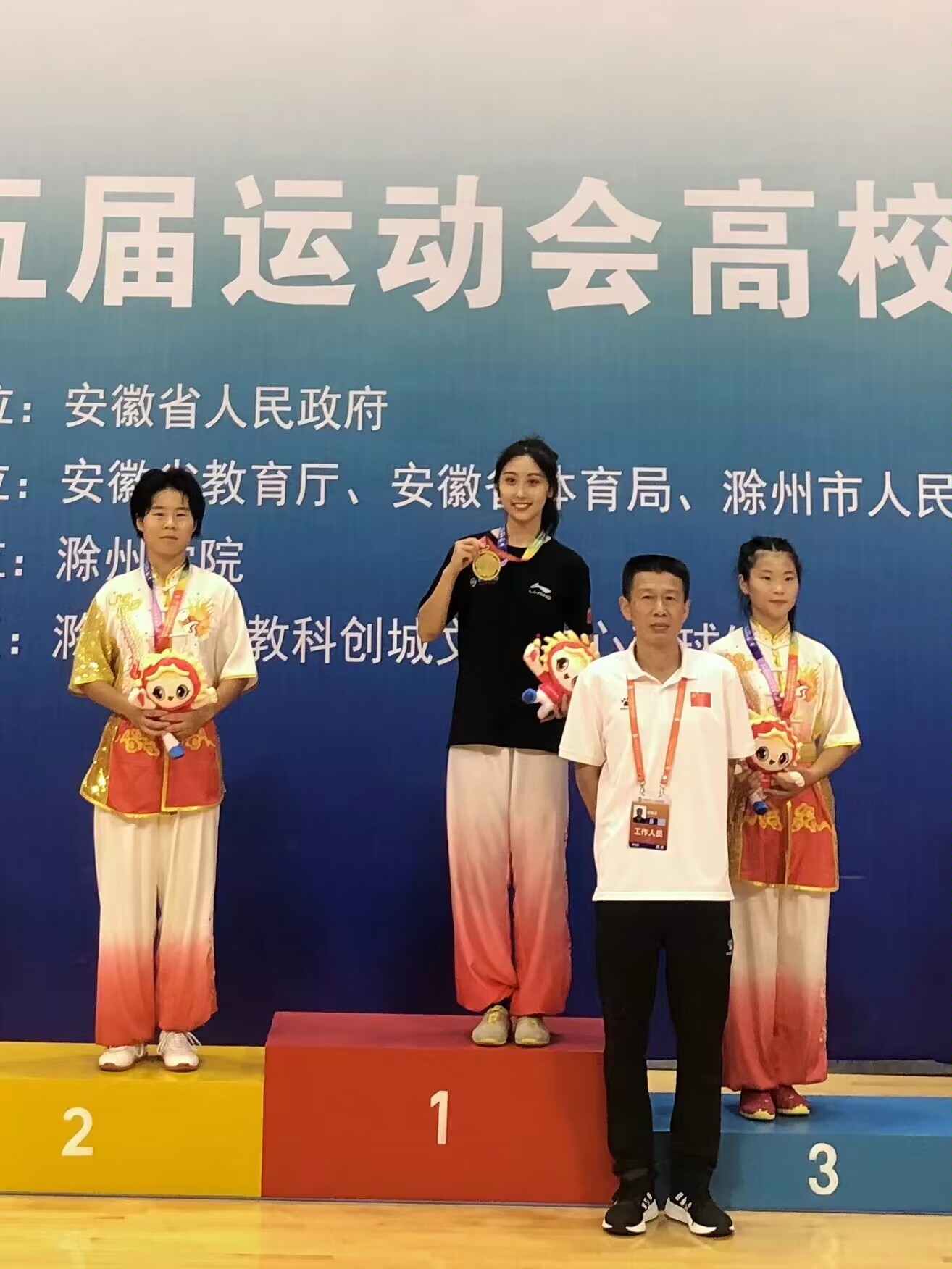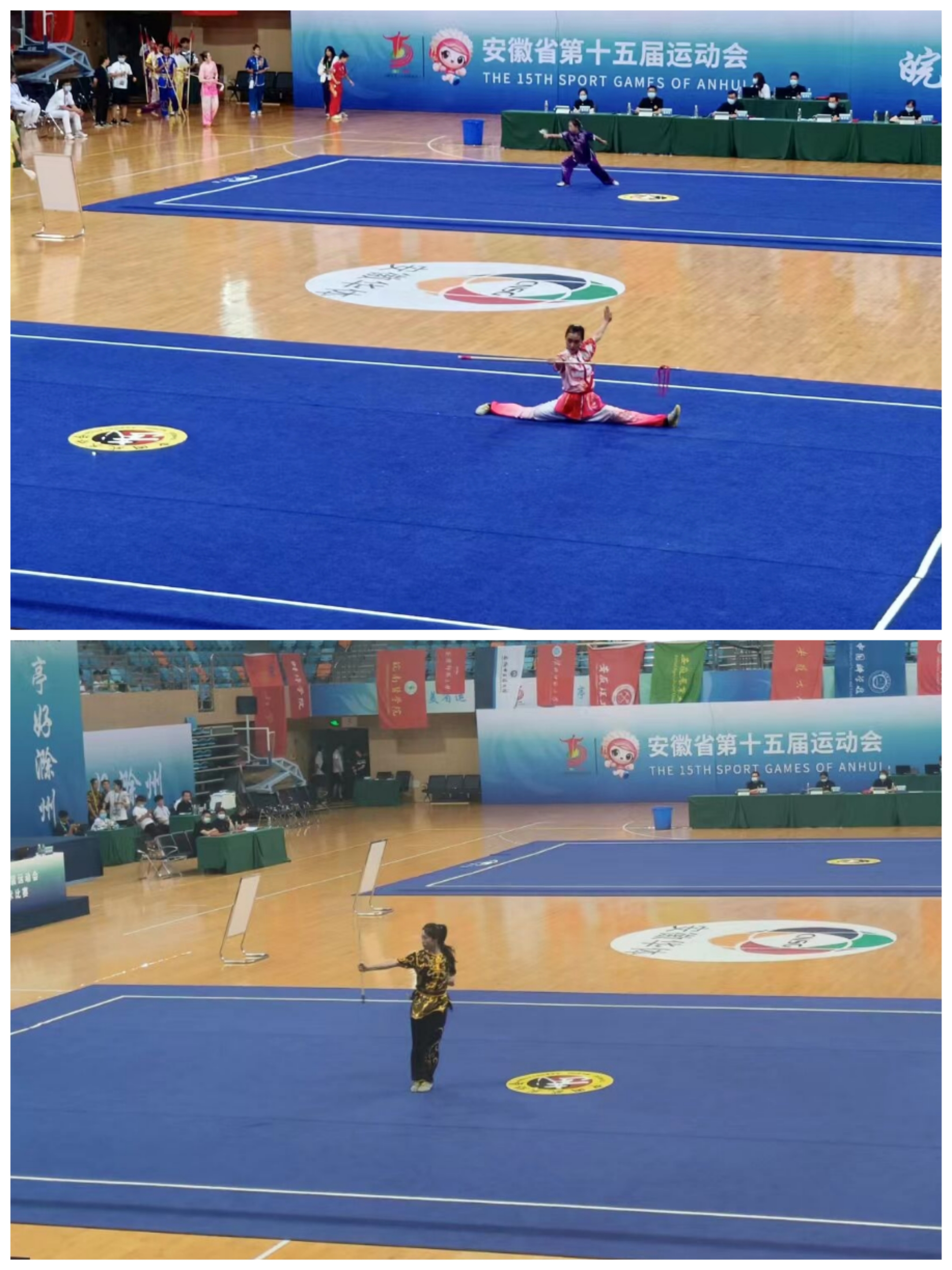 近日,由安徽省政府、安徽省教育厅、安徽省体育局主办的安徽省第十五届运动会高校部武术比赛在滁州市举行。我校代表队顽强拼搏,取得优异成绩,其中我院20级本科生江安琪同学荣获女子甲组自选枪术金牌,自选长拳第八名,21级本科生周丽莎取得了女子自选棍术第四名、女子对练第六名的好成绩!