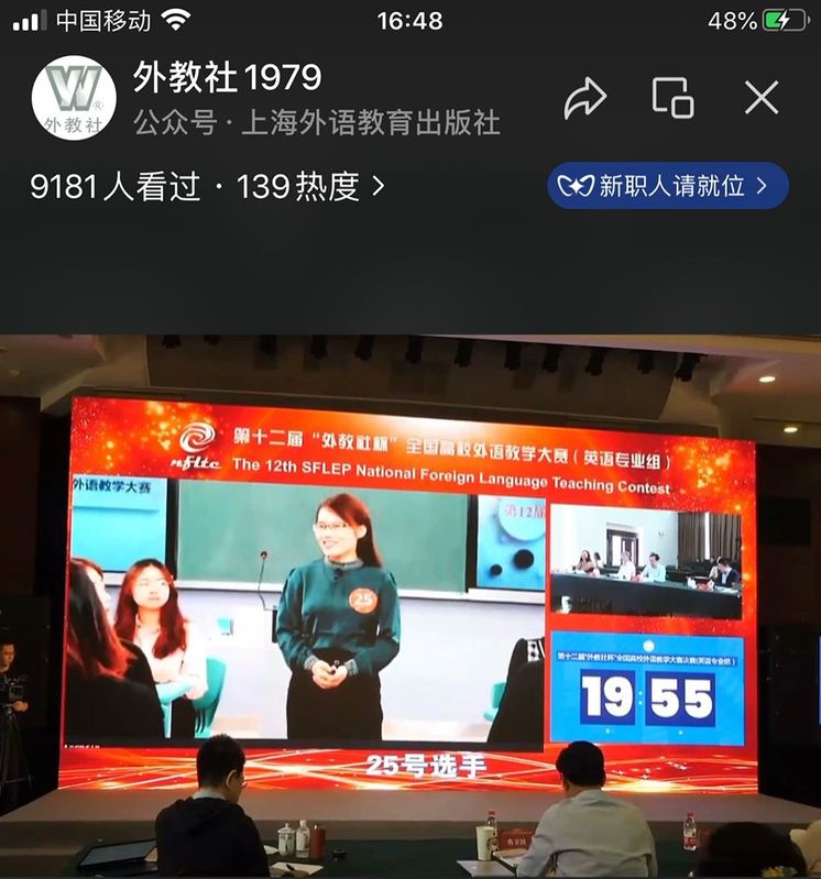 9月23日—25日,第十二届“外教社杯”全国高校外语教学大赛(外语类专业组)全国决赛、总决赛成功举办。比赛采用选手在线授课、评委线上线下评审的形式。大赛在网络同步直播,吸引了近30万人次在线观看,盛况空前。随后,第十二届“外教社杯”全国高校外语教学大赛(外语类专业组)全国总决赛获奖名单公布。