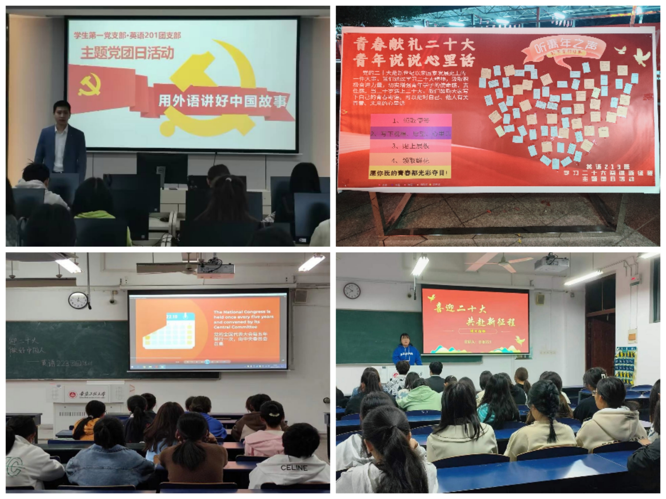 外国语学院全面系统学习贯彻落实党的二十大精神,早计划、强学习、重落实,扎实推动党的二十大精神的学习宣传贯彻,将学习活动落实到每个党团支部,全面兴起了学习宣传党的二十大精神的热潮。下一步学院将在学深悟透、学以致用上继续加大力度,确保学习党的二十大精神落地生根见行见效。