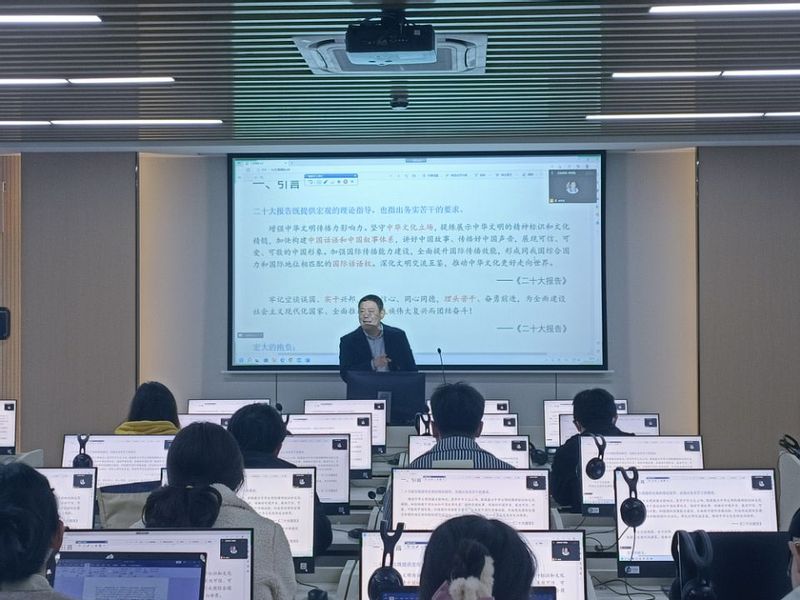 刘运锋解读了二十大报告中关于中国话语体系构建、中国文化传播等重要论段,并以此为切入点,从语言学的角度分析了外语使用中经常产生的语义韵冲突,结合案例提出了克服语用不当的语言学方法和策略,探讨了如何讲好中国故事的路径和举措。他认为党的二十大报告为文化发展和增强中华文化国际影响力指明了方向,对英语专业人才尤其是翻译硕士同学提出了更高要求,责任重大、使命光荣,大家必须坚定文化自信,既要通晓中国实际、又要了解世界大势,不断提升专业素养,义不容辞地承担起加强对外文化交流和多层次文明对话,构建中国特色的话语体系,助力中国形象的国际传播的责任担当。