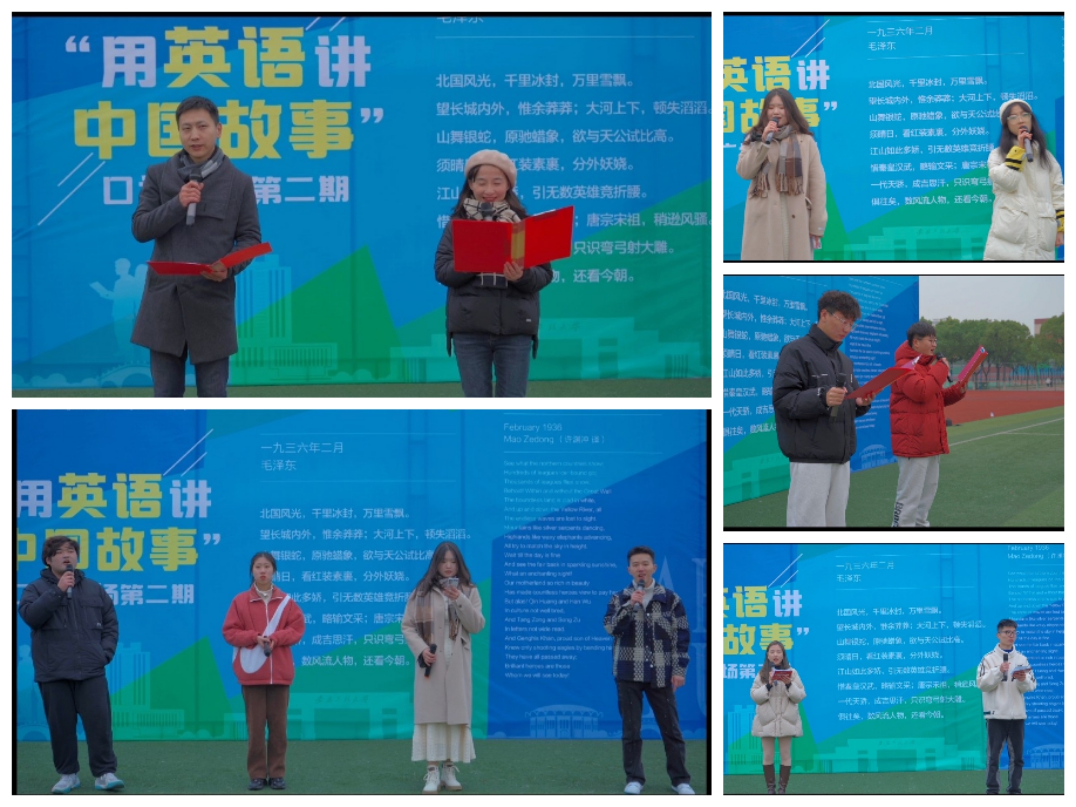冬日微寒,主持人带动全体人员进行热身活动。大家跟随音乐和口令活动,几轮热身之后,现场气氛不断升温。当古韵诗篇遇上英文会碰撞出怎样的火花?慷慨激昂的《将进酒》中英对照朗诵让我们感受到了李白的潇洒不羁和旷达情怀。“归去,也无风雨也无晴”,中英对照朗诵《定风波》,将乐观豁达的情绪传递给现场人员。张君和王焱共同朗诵毛主席的《沁园春·雪》,仿佛让大家置身北国壮丽的雪景之中,将毛主席的伟人风范以及对祖国壮丽山河的热爱表达地恰到好处。