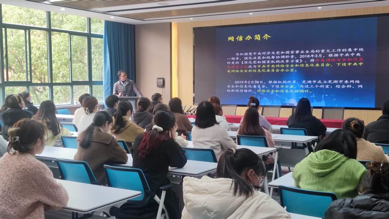 夏有新首先介绍了芜湖网信办的工作职能及我国信息产业发展概况,指出我国信息产业正处于飞速发展期,较之前有了质的飞跃,大数据、虚拟现实和人工智能构成信息产业的核心部分。他结合最近爆火的聊天机器人“ChatGpt”现象给大家普及了网络安全知识,提醒大家网络存在的诸多隐患,警醒大家网络安全意识不足甚至会增加政治安全风险,威胁社会稳定,并为大家提供了安全上网小窍门,提醒大家电脑、手机等电子设备设置锁频密码,使用正版软件等,防止信息被盗取造成个人信息泄露,引发网络安全事故。最后,夏有新希望同学们时刻牢记“习近平总书记的网络安全观”,切记“没有网络安全,就没有国家安全”,希望同学们明白信息时代风险与机遇共存,在保持学习热情,紧跟科技前沿的同时要学会甄别网站,安全上网,科学上网。
