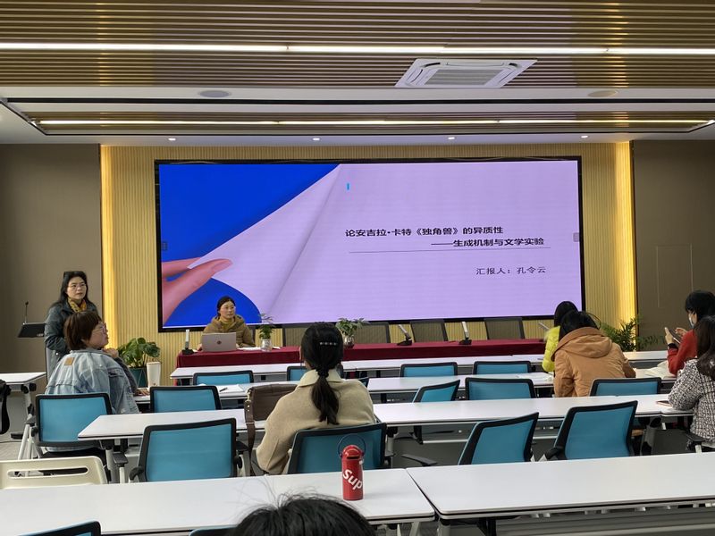 报告会上,孔令云作了题为“安吉拉·卡特《独角兽》的异质性——生成机制与文学实验”的学术报告。她从安吉拉·卡特这名女性作家的简介和作品特质出发,介绍了作家创作诗歌《独角兽》的背景和动因,并从20世纪60年代英国社会的异质文化语境、创作主体独异的诗学思想及独特的经验自我三个层面详细剖析了《独角兽》。报告从哲学立场和美学形式两大视角,挖掘了安吉拉·卡特诗歌的异质性文本特征,展示了卡特的“异质性书写”的思想意义和美学价值。报告会后,学院教师就安吉拉·卡特的作品语言风格、创作手法和生活感悟等问题与孔老师展开进一步交流和讨论。
