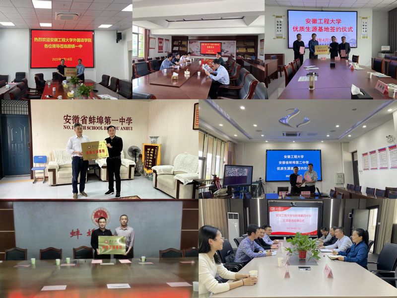 为进一步拓展我校优质生源地,吸纳更多优秀人才,促进高校与高中的交流合作,4月17至19日,受校长卢平的指导和委派,根据学校安排,外国语学院党委书记董金权、副院长李新国、系部主任等一行赴蚌埠市及辖县相关中学开展招生宣传,与蚌埠一中、蚌埠二中、蚌埠三中、蚌埠四中、怀远一中、五河一中、固镇一中等七所省示范高中签订了优质生源基地协议并进行了授牌,并在相关中学与高三同学开展面对面宣讲交流。