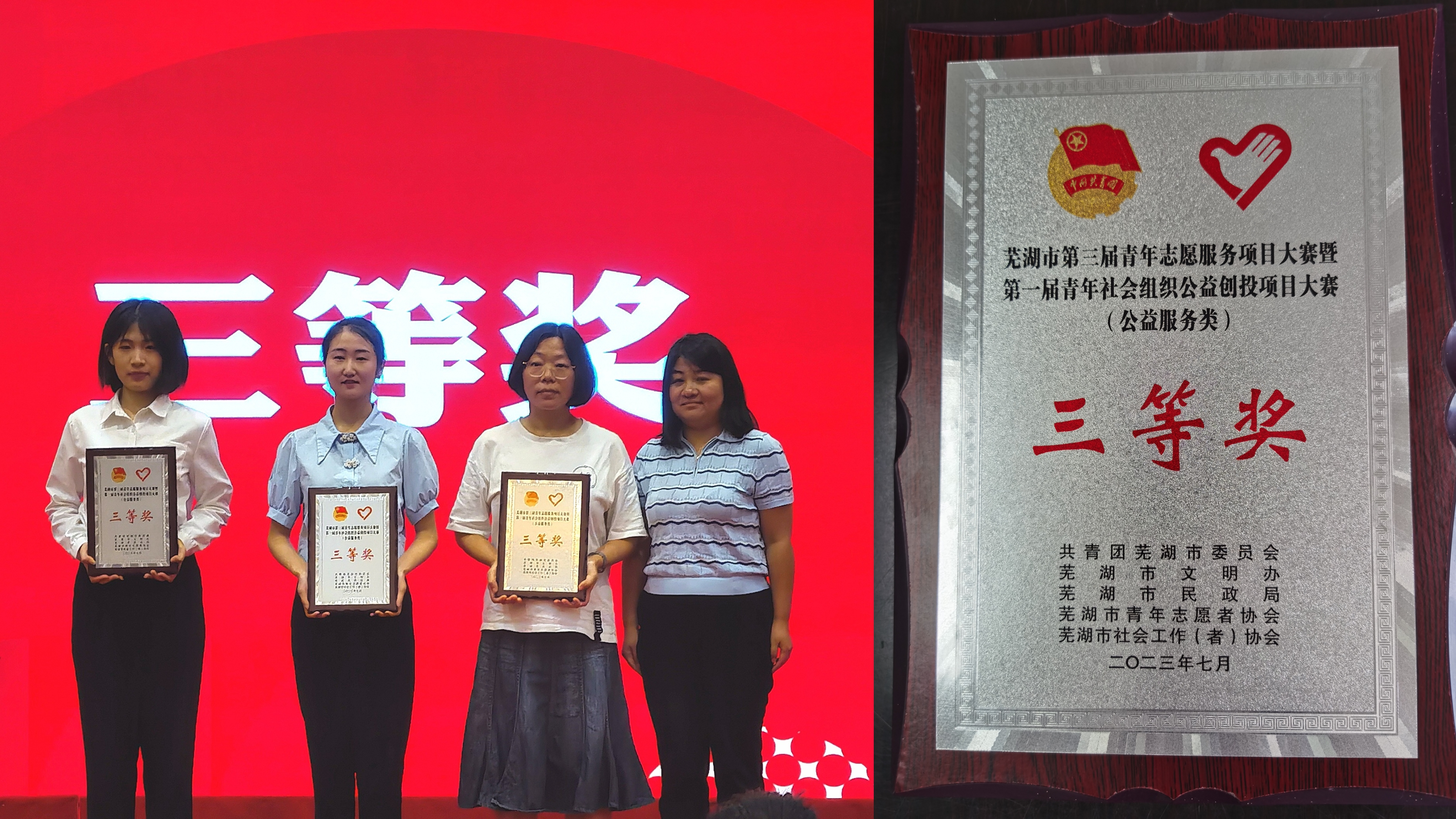 经过校团委和外国语学院党委精心组织安排,7月11日,外国语学院“紫阳花”关爱环卫工人志愿服务团队参加芜湖市第三届青年志愿服务项目大赛暨第一届青年社会组织公益创投项目大赛公益服务类决赛经过激烈角逐,最终“紫阳花”团队获得三等奖的好成绩。紫阳花团队指导老师以及两名团队核心成员参加了比赛。