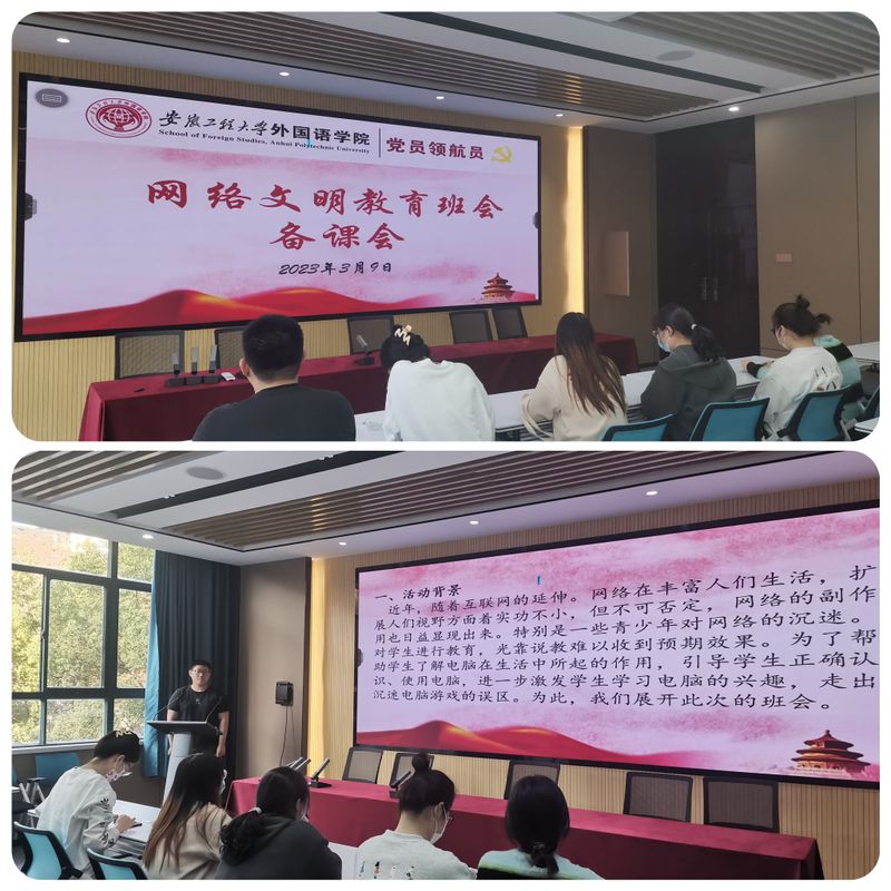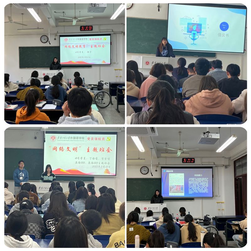 为引导大学生文明上网,争做清朗网络空间的共建者、共享者,共同营造健康向上的校园网络环境,3月13日,外国语学院党员领航工作室中的8名“41号学员”面向大一、大二各班级开展网络文明教育主题班会。