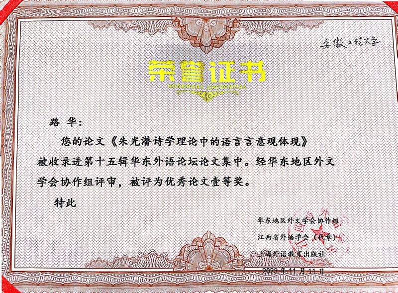 本次论坛还设有语言学研究组、外国文学研究组、外语教学研究组、翻译理论与实践研究组、课程思政与跨文化交流研究组5个交流小组,有50多位参会教师按照小组主题进行了分会场讨论。我校外国语学院路博士华在语言学研究组做了“朱光潜诗学理论中的语言言意观体现”的论文发言报告,讨论了朱光潜的种种诗学理论观中,无论是对诗所下的定义、对诗的节奏音律的探讨,还是对当时新诗误区的批判、对诗的难易的讨论,都体现了朱光潜强调情感思想与语言辩证统一的语言言意观,得到与会老师们的好评。在本次论坛推出的《华东外语论坛第15辑》中,路华博士的论文成功入选,并在优秀论文评比中获得一等奖。这是路华博士继2018年获得第十五届华东外语论坛论文一等奖之后,再次获此殊荣。