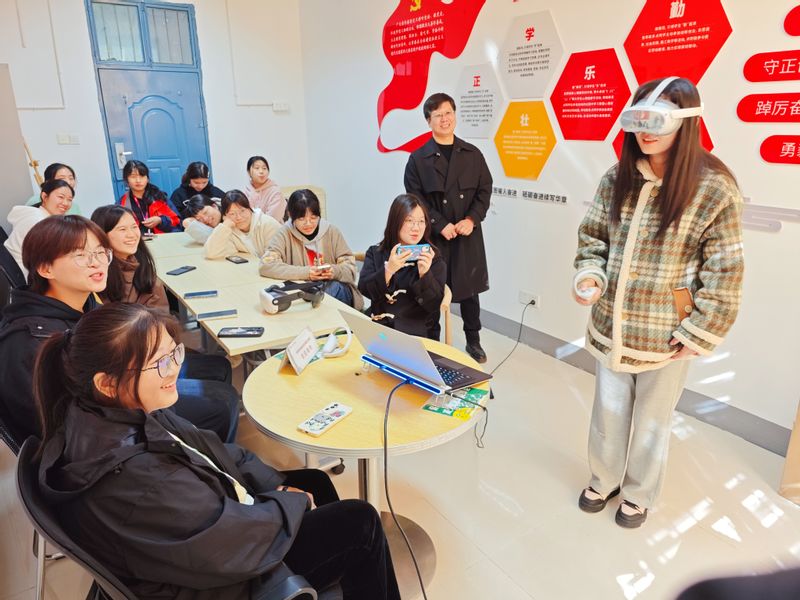 苏涛围绕其开设的《AI创新与创客教育》校企共建课程,介绍了学院“AI+英语”人才培养方案,详细讲解了目前AI技术在英语相关领域的应用及前沿研究。工程师向同学们介绍了VR设备的发展历程和应用前景,并结合学生们所关注的AI、VR、AR主题,重点讲解了VR头显设备和主流AI语言模型对同学们语言学习的影响。同学们现场体验了学院虚拟仿真实验室装配的PICO4型VR头显设备。