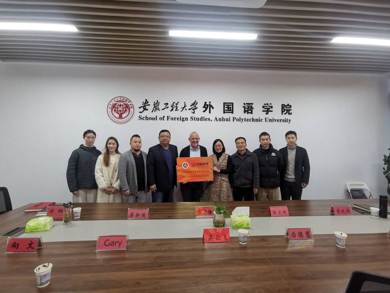 12月11日上午,应外国语学院邀请,安徽金宁外事服务有限公司总经理吴云飞、培训中心主任后德慧、学术总监Gary(英国籍)一行五人来校洽谈校企合作事宜。继续教育学院院长许钢,国际交流与合作处副处长张文明以及继续教育学和外国语学院相关负责人出席,外国语学院副院长(主持工作)唐雪梅主持座谈。