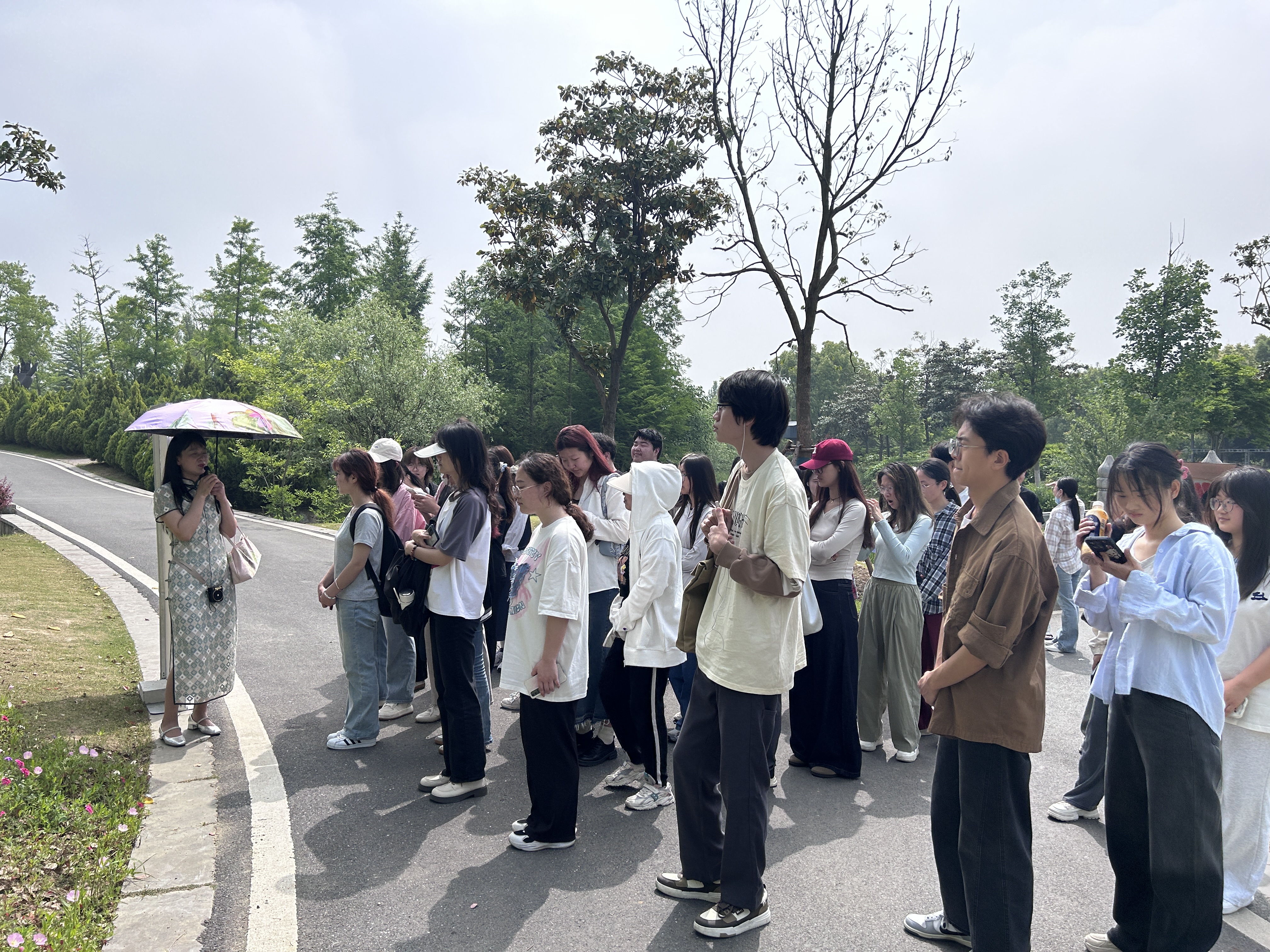 随后,师生们共赴雕塑公园,踏足这片绿意盎然的天地。他们沉醉于形态多样的植物之中,同时目光也被园内摆放的精致雕塑所吸引。在欣赏雕塑的精致与独特之时,同学们更体会到了雕塑与植物间那种和谐共生的美妙景致。张群老师深入浅出地阐释道,花艺并非遥不可及,它就在我们生活的点滴之中,既源于生活,又超越生活,与我们的日常生活紧密相连。通过对花艺与雕塑的鉴赏,同学们得以更深入地领悟生活的美好与真谛。