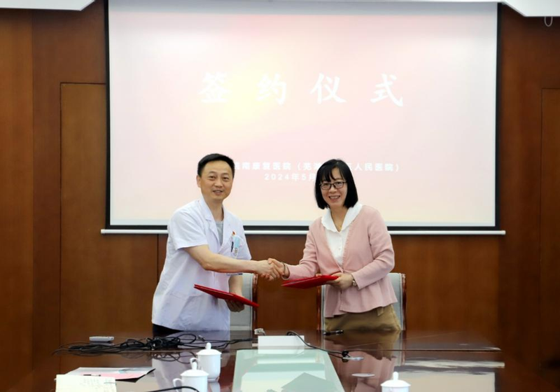 5月14日, 外国语学院与安徽省皖南康复医院举行战略合作协议签署仪式。外国语学院主持工作副院长唐雪梅、皖南康复医院副院长胡剑辉、各科室主任、以及外国语学院教师代表出席签约仪式。此次合作协议的签署标志着双方在科研合作、人才培养等领域的深入合作迈出了坚实的步伐,预示着未来将在更多层面实现资源共享与优势互补。
