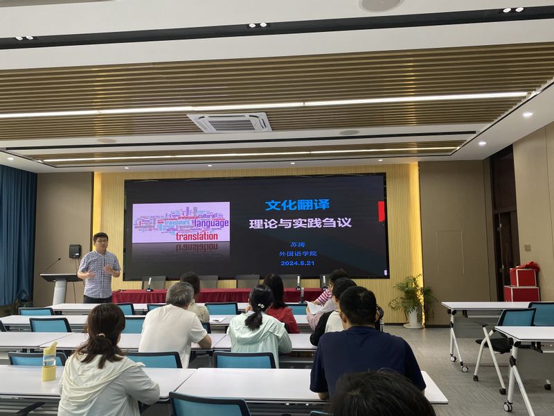 苏涛博士作了题为“文化翻译理论与实践刍议”的学术报告。苏博士从目前文化翻译领域的主流翻译理论出发,介绍了生态翻译学理论、译介学理论、多模态话语分析理论等,梳理了这些理论的发展及应用情况,并结合具体的翻译实例,从翻译理论、翻译原则、翻译标准、翻译策略、翻译方法等方面详细分析了文化翻译领域的主要概念,分享了在文化翻译中的非遗翻译、文学翻译、诗歌翻译中的心得体会,从而探讨了文化翻译的发展趋势及未来文化翻译所面临的机遇和挑战。
