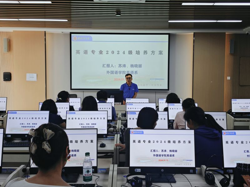 9月10日下午,外国语学院组织英语专业2024级全体本科生导师召开本学期第一次培训暨工作交流会。学院副院长李新国、英语系主任苏涛、副主任杨晓丽以及2024级全体本科生导师参加了会议,会议由苏涛主持。
