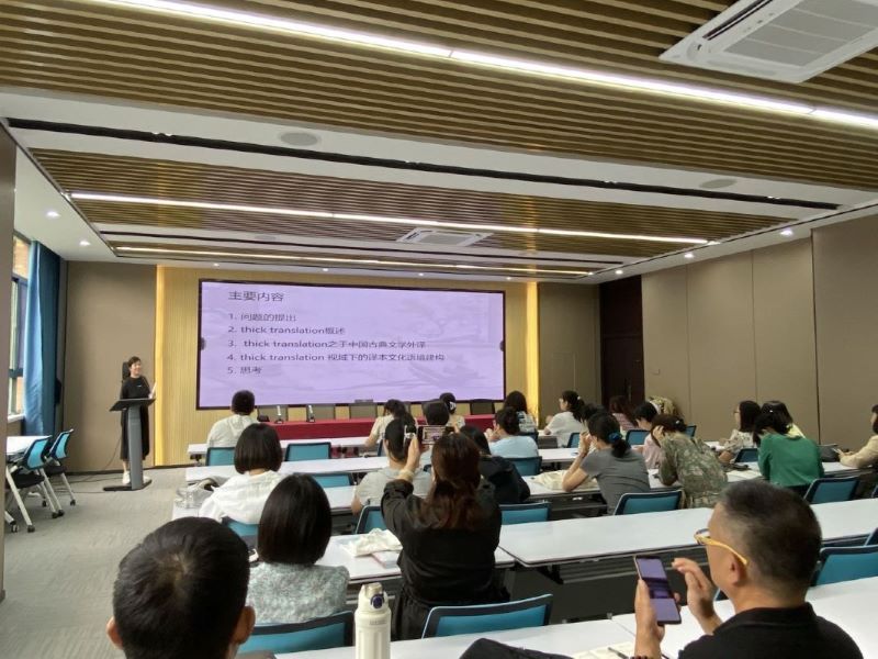 韩娟博士作了题为“中国古典文学外译中的thick translation与文化语境建构”的学术报告。韩娟博士首先阐述了“thick translation(厚译或深度翻译)”这一概念的核心内涵,指出了中国古典文学作品通过丰富的文学形式和深刻的思想内涵,传承和弘扬了中华优秀传统文化以及对后世产生的深远影响。然后,进一步详细分析了在中国古典文学翻译过程中,通过添加注释、评注等手段,将译本置于丰富的文化意蕴和文化语境中,加深读者对源语文化的尊重和了解;同时,在保持原文核心意义的基础上,进行策略性的删减即“薄译”有时也能达到“厚译”的效果。此外,韩娟博士还结合具体案例,分析了中国古典文学翻译中的常见问题及解决方案,通过关注不同语境下的翻译规范,了解目标语的文化背景,以确保译文的准确性和可读性。