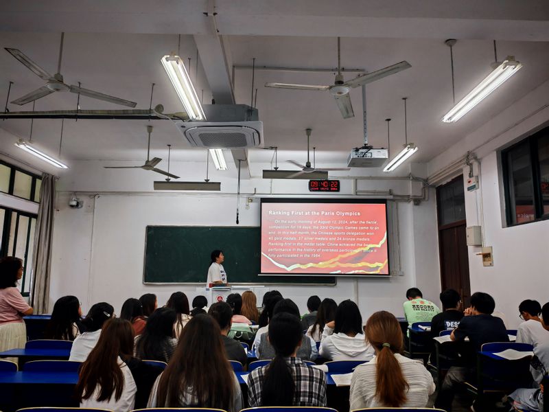 “开学第一课”,新生登台演讲初体验,英语口述传统文化精彩纷呈。9月下旬,2024级新生迎来了他们大学里的第一堂英语课。与以往不同的是,这次课程导入在课前就已经完成。公共英语课的老师们课前向同学们介绍了“课堂五分钟”“用英语讲中国故事”活动方案,为大家提供了汇报主题池供参考,按照班级规模和学生构成进行了分组,对演讲注意事项等进行指导。新同学们跃跃欲试,小组间分工明确,合作收集素材,制作ppt,现场汇报气氛热烈。从古代先贤孔子所倡导的儒家思想,到中国茶文化的历史传承,再到都江堰等古代水利工程奇迹等。这些历史人物、文化习俗、现代成就,都在他们的讲述中焕发出新的光彩。区块链241班的刘德恩同学说:“第一次上这样的英语课,与高中完全不一样。第一次课就站到讲台上进行展示,我感到很新奇,也很幸运。通过用英语讲述中国故事,我们不仅锻炼了自己的口语表达能力,还加深了对中国文化的理解和认同。这样的活动对我们的成长非常有帮助。”法学243班的朱俊豪同学在完成演讲后激动地说:“站在台上的每一刻都充满了挑战,但当我看到老师和同学们的认可和掌声时,更多的是成就感。这不仅是一次语言的展示,更是自我成长的宝贵经历。我感受到了用英语讲述中国故事的力量,也更加坚定了自己学好外国语,做好中国人,传播好中国声音的决心。”