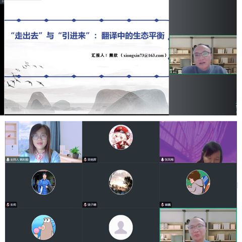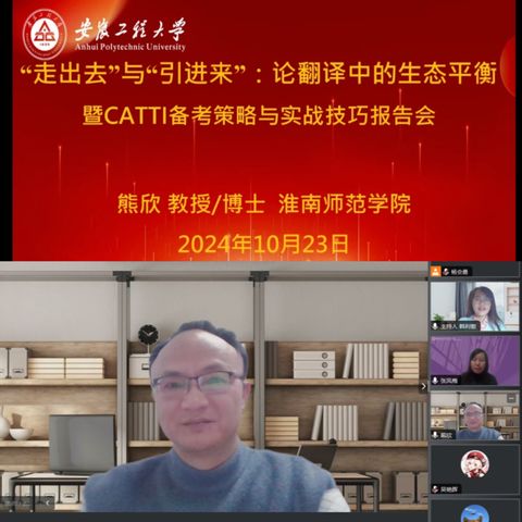 1023日晚,外国语学院通过腾讯会议开展了全国翻译专业资格(水平)考试(China Accreditation Test for Translators and Interpreters,简称CATTI备考策略与实战技巧报告会,活动邀请淮南师范学院教授熊欣博士,做了题为《“走出去”与“引进来”:论翻译中的生态平衡》的学术报告,针对CATTI二级笔译考试对研究生进行了考前指导。副院长韩利敏教授、张凤梅教授、学院硕士生导师以及全体研究生参加了此次线上学术交流活动,活动由副院长韩利敏在线主持。