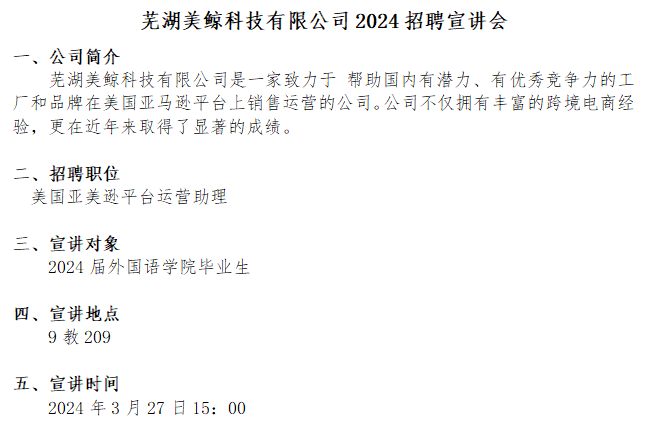 芜湖美鲸科技有限公司2024招聘宣讲会