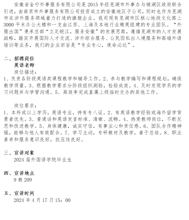 安徽省金宁外事服务有限公司2024招聘宣讲会