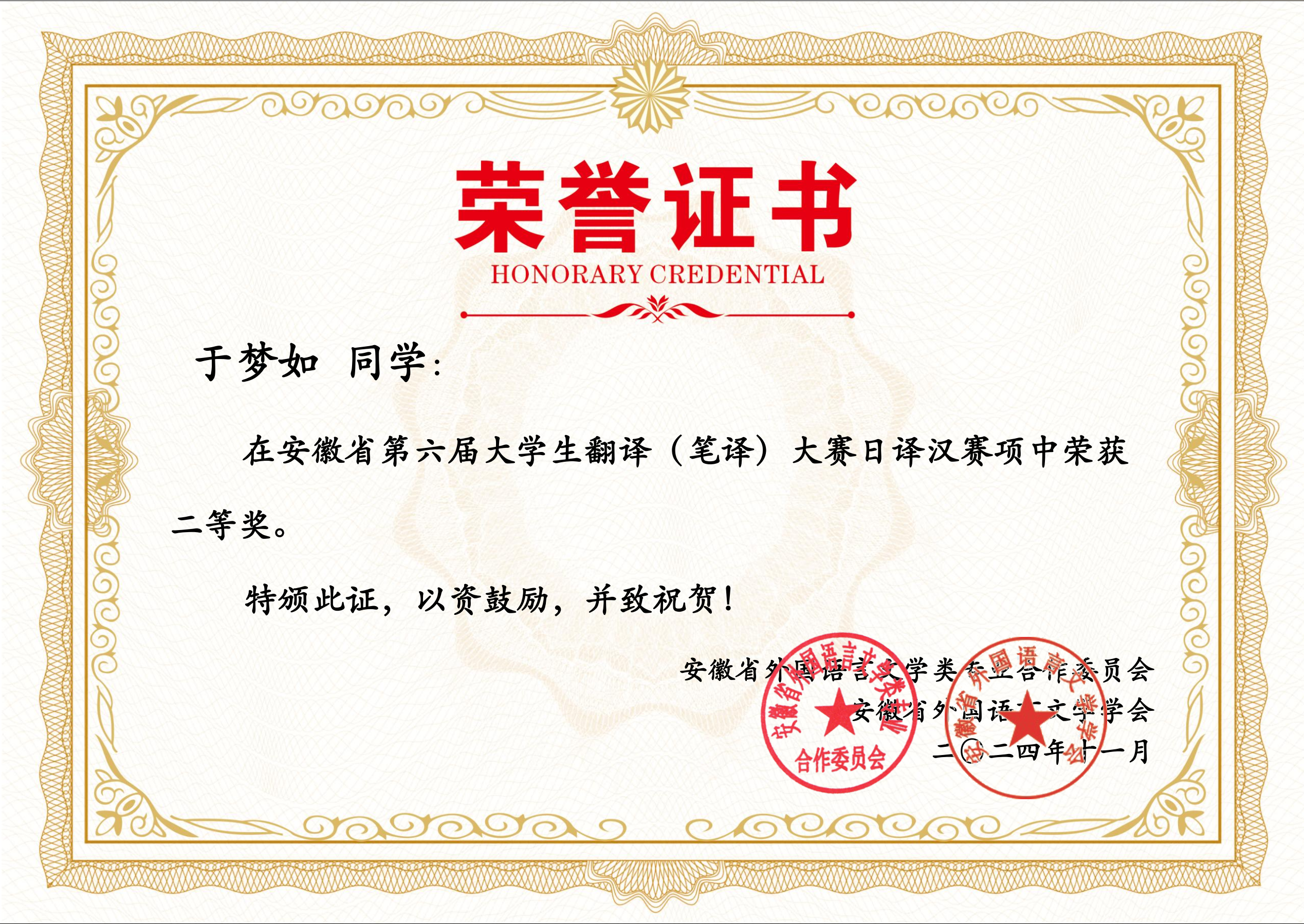 11月18日,安徽省外国语言文学学会公布了安徽省第六届大学生翻译(笔译)大赛获奖名单。我校日语专业22级程宝庆同学荣获日译汉组一等奖,马文燕和于梦如同学荣获日译汉组二等奖,外国语学院陈爱云、曹银阁和韦芳三位老师获“优秀指导教师”奖。