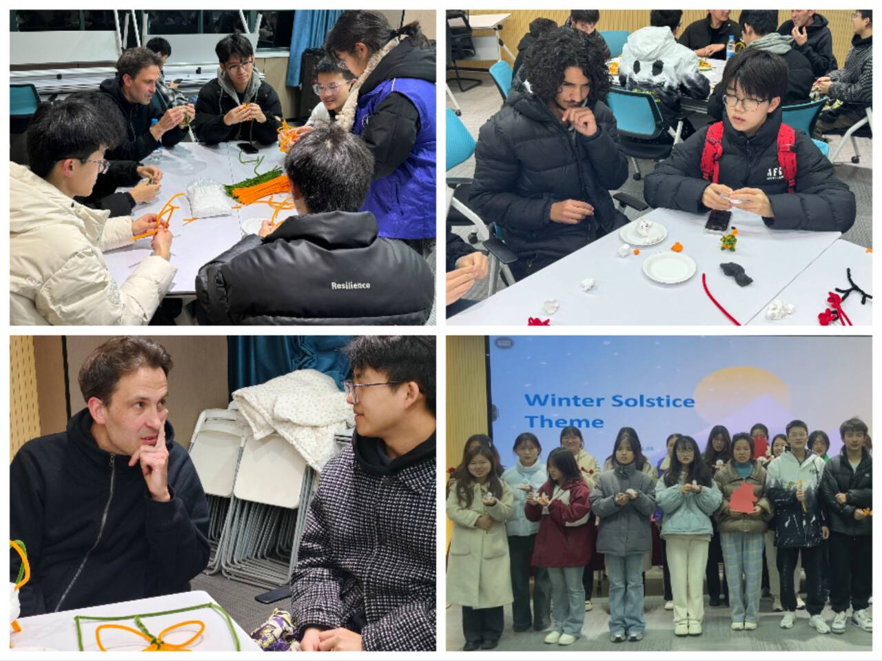中外话“团圆”,如意促和谐。为进一步加强中外文化交流,12月6日晚举办的“口语广场-英语角”热场活动以冬至这一传统节日为主题,成功地将中国传统文化与英语学习巧妙地融合在一起,为参与者带来了一场别开生面的文化盛宴。热场活动中,中国学生与来自英国的外籍教师Michael以及来自摩洛哥的留学生Omar、Nasir围坐在一起,一边体验传统剪纸和扭扭棒手工制作,一边用英语亲切地与他们介绍冬至传统习俗。他们讲述了冬至的历史由来、吃饺子和汤圆的传统寓意,以及家家户户团聚一堂共度佳节的温馨场景。外教和留学生们兴奋地在中国学生的指导下制作手工,同时他们还积极提问,了解更多关于冬至和中国传统文化的细节。不到半个小时的时间,梅花、柿子、十二生肖等图案的手工制品顺利完成,中外师生一同拿起自己亲手制作的手工合影留念。