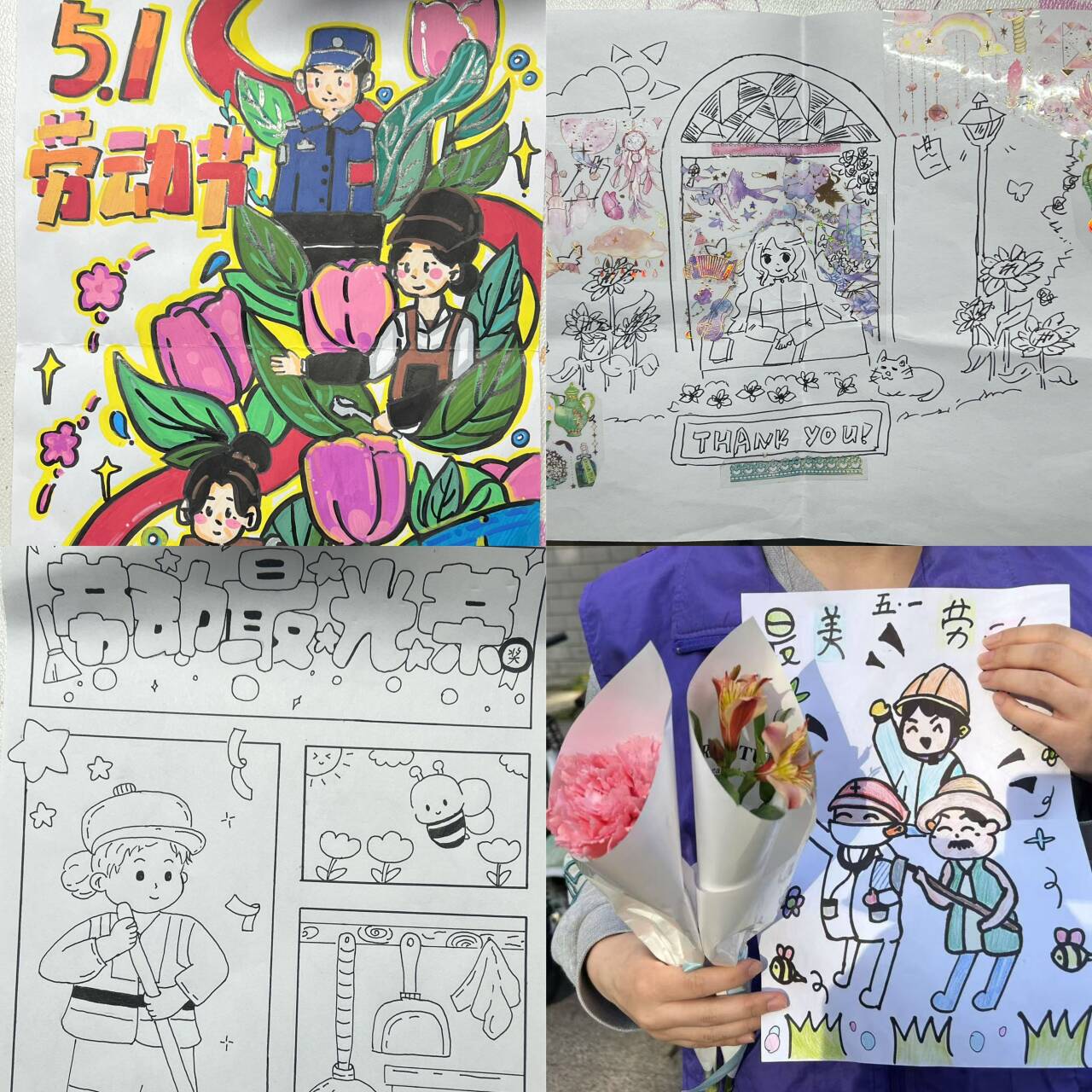 志愿者们提前两周策划准备,用镜头记录宿管员凌晨巡查楼道、门卫雨中值守的动人瞬间,并将这些场景转化为系列水彩画。活动中,每一份礼品均精心定制:手绘明信片印有劳动者的工作剪影,向日葵与康乃馨花束缀满祝福丝带,礼包内还包含保温杯、防滑手套等实用物品。“这些画里的场景,就是我们的日常啊!”收到礼物的宿管阿姨眼眶微红。