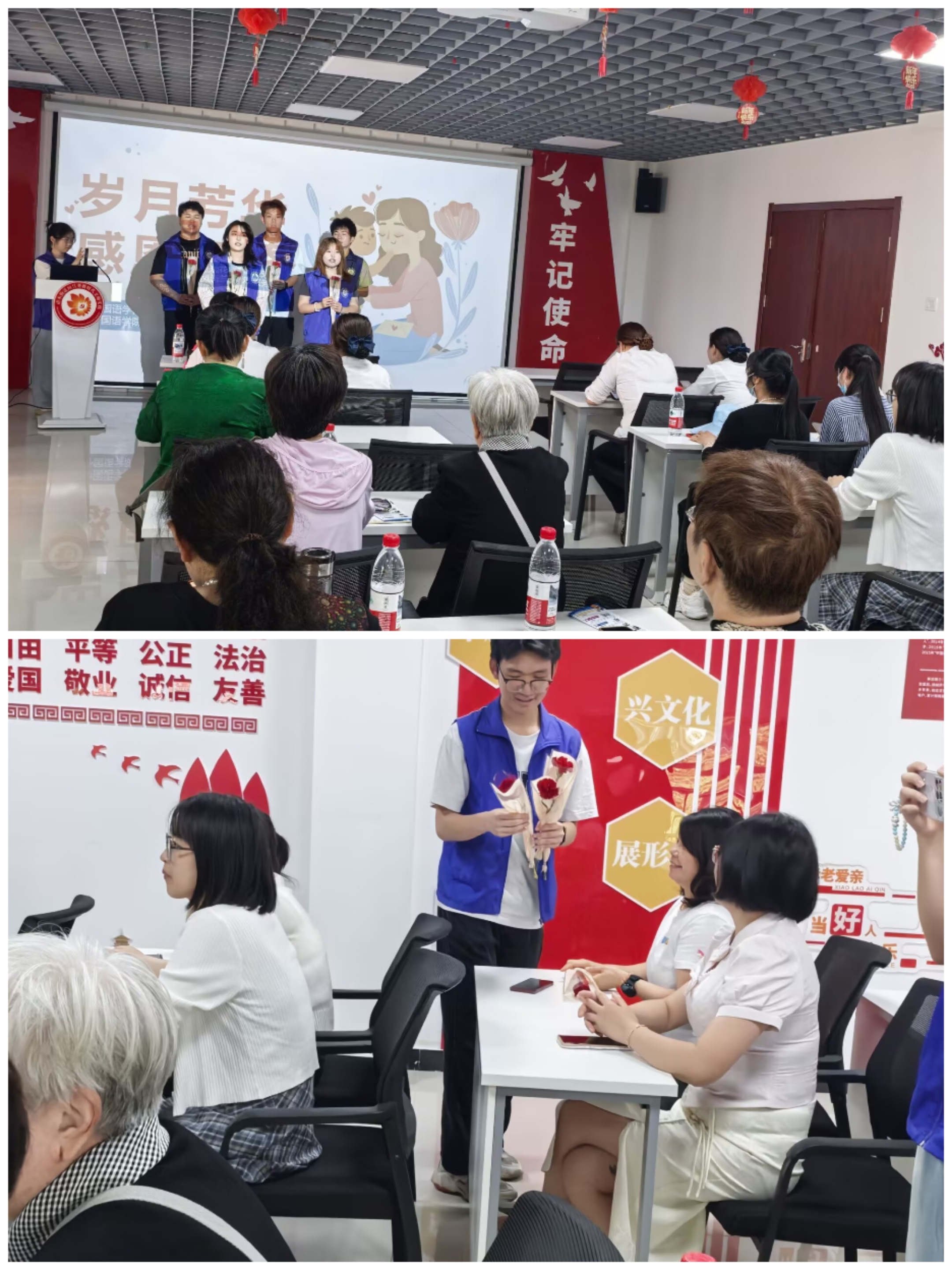 歌声传情献鲜花,感恩之心暖心间。活动在温情洋溢的氛围中拉开帷幕。外国语学院志愿者丁然、蒋艳等五人深情献唱《感恩的心》,清澈歌声中饱含对母亲无私奉献的敬意。演唱期间,志愿者手捧鲜花依次赠予在场中老年女性居民,娇艳花束与银发长者的灿烂笑容交相辉映,现场流淌着温馨动人的暖流。