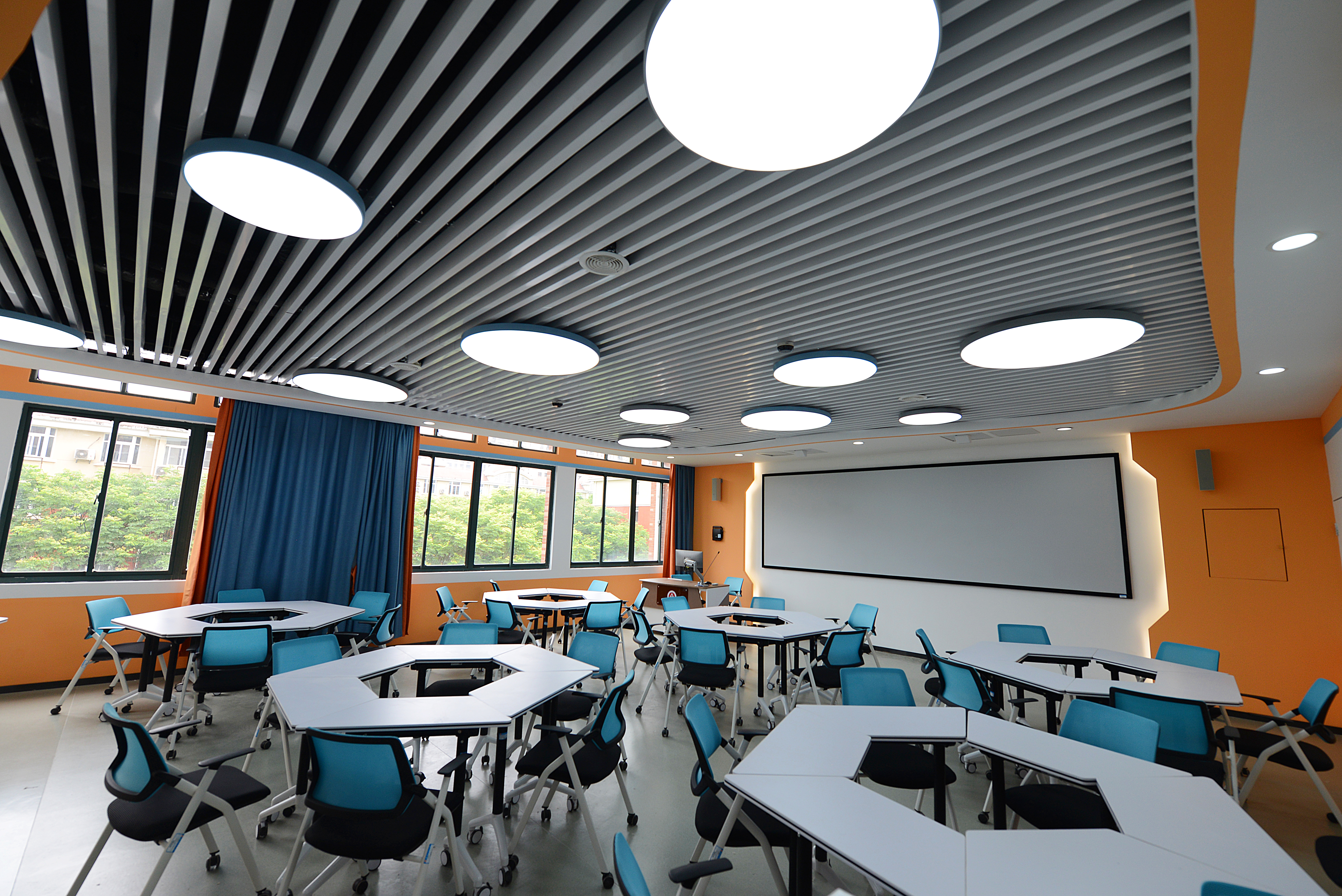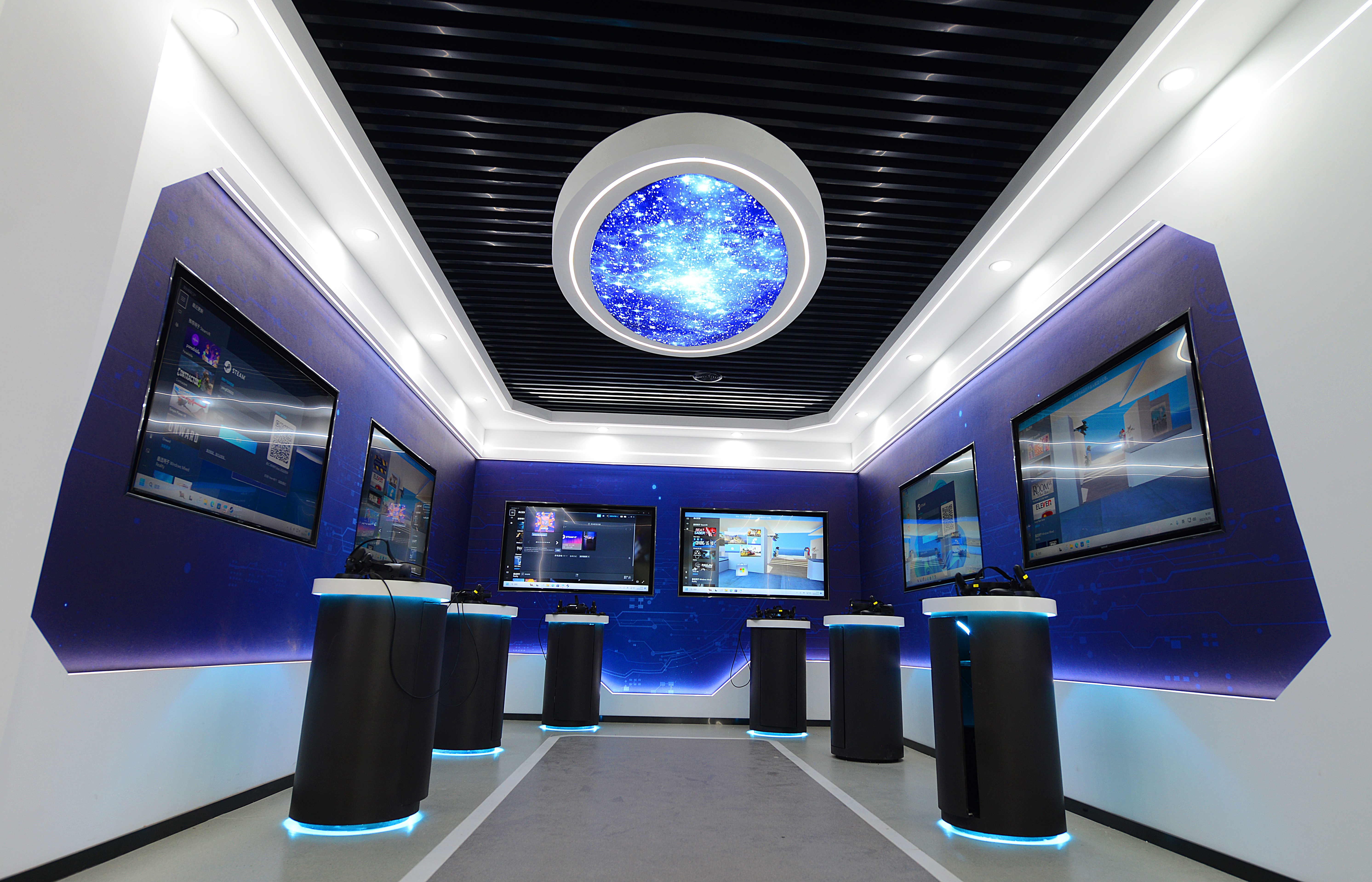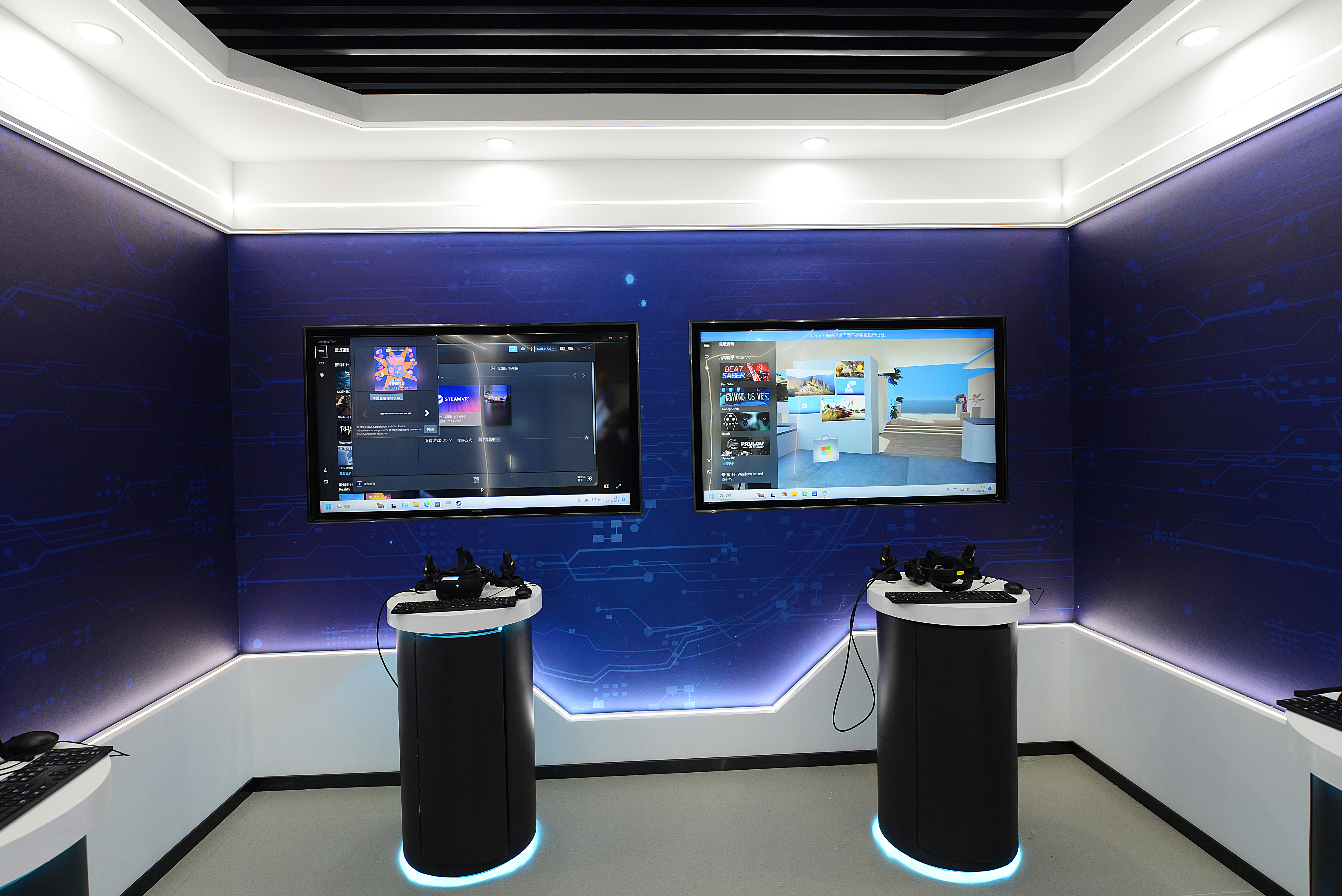 外国语学院虚拟仿真实验室是依托虚拟现实(VR)、混合现实(MR)等先进技术构建的语言实践与跨学科综合实训平台,实验室采用中科睿智虚拟仿真实验平台,配备VR头盔套装40套、小组演示式VR交互设备6套,通过三维建模技术构建商务谈判会场、国际会议厅、酒店、机场等典型外语应用场景,实现多人协同实训与角色互动。VR头盔实时记录实训过程数据(如翻译准确率、反应速度),生成个性化训练报告,辅助教学反馈优化。系统内置跨文化交际、英语口译、日语跨文化交际、英语演讲等四套虚拟仿真软件,帮助学生从单一语言训练向“外语+专业”复合能力培养的转型升级。