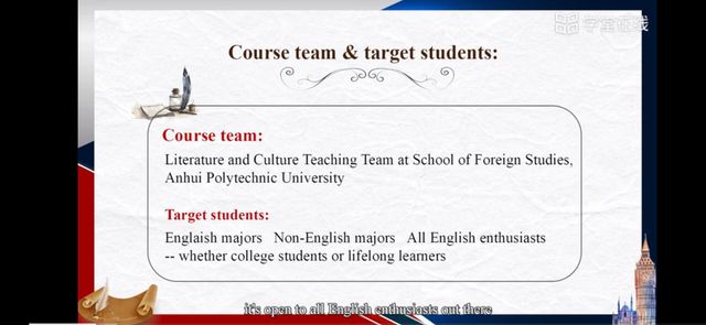 课程简介:《英美文学》(British-American Literature)是一门旨在训练学生思辨能力的外国文学课程,视频由文学的主要类别——《神话》《戏剧》《诗歌》《小说》四章构成,每章下设3个作品,每个作品由作品主题、艺术手法、创作特色三个相互关联的专题构成,共计40课时。课程以课程思政为抓手,在对英美经典作品传统理解的基础上,采用新视角,给出新阐释,不仅针对英语专业的学生,而且放眼于所有学习英语的大学生及社会学习者,开拓学生思维、扩展知识面、培养创造力,满足学生自主化、个性化学习需求。线上学习随时随地,平台自动打分,增加学生的获得感。