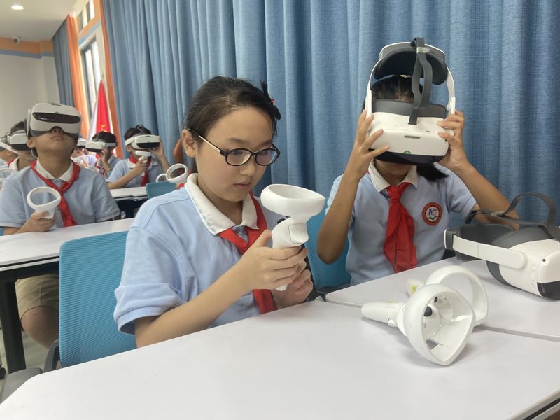 在老师的带领下,学生们满怀好奇地走进实验室,戴上先进的VR头盔,沉浸式体验《道德经》故事的深刻寓意。他们化身为虚拟角色跨越国界,感受异域文化,与虚拟场景中的各国人物展开对话。尽管英语发音还比较青涩,但每一个单词都蕴含着他们对未知世界的探索热忱。系统自动记录下他们的声音,并立即进行精准的语音、语调与语义评判。这些数据被实时转化为可视化的学习报告,如同游戏通关记录般直观地呈现在屏幕上,让孩子们清楚地看到自己的进步与不足。