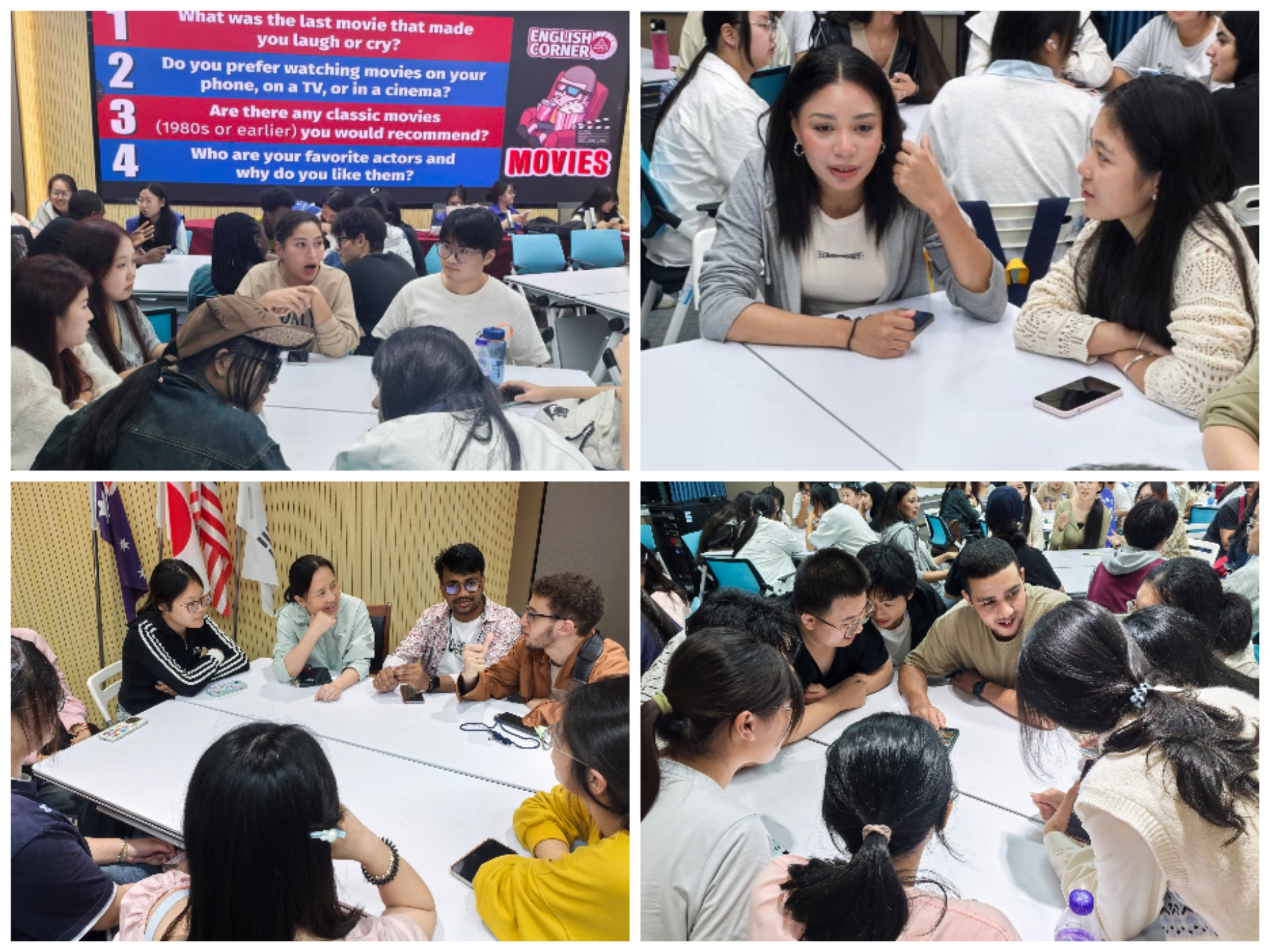 “今晚聊到触动人心的电影时,我试着用英语分享了成龙主演的《尖峰时刻》带给我的震撼。”英语专业大一新生吴心怡坦言,这样的实战场景让她愈发敢于开口,也学会用英语传递真实情感。第四次参与英语角的留学生Inasse同样收获满满:“通过‘电影’这个话题,我不仅认识了更多中国朋友,还了解到《长安的荔枝》这类中国本土作品;而当我介绍摩洛哥著名电影取景地卡萨布兰卡时,大家也表现出浓厚兴趣,这种跨文化交流太有意义了。”