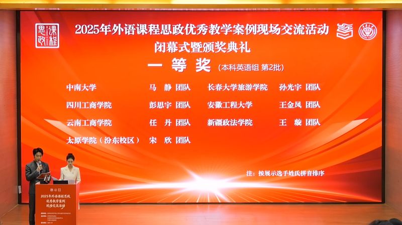 11月21日至23日,由教育部高等学校大学外语教学指导委员会指导,高等教育出版社、全国高校教师网络培训中心、《中国外语》编辑部主办的“2025年外语课程思政优秀教学案例征集与交流活动”在重庆大学举行。外国语学院王金凤教师团队(王金凤、喻晓静、崔燕、汤琳)凭借深厚的教学积淀与创新的思政设计脱颖而出,斩获全国一等奖。
